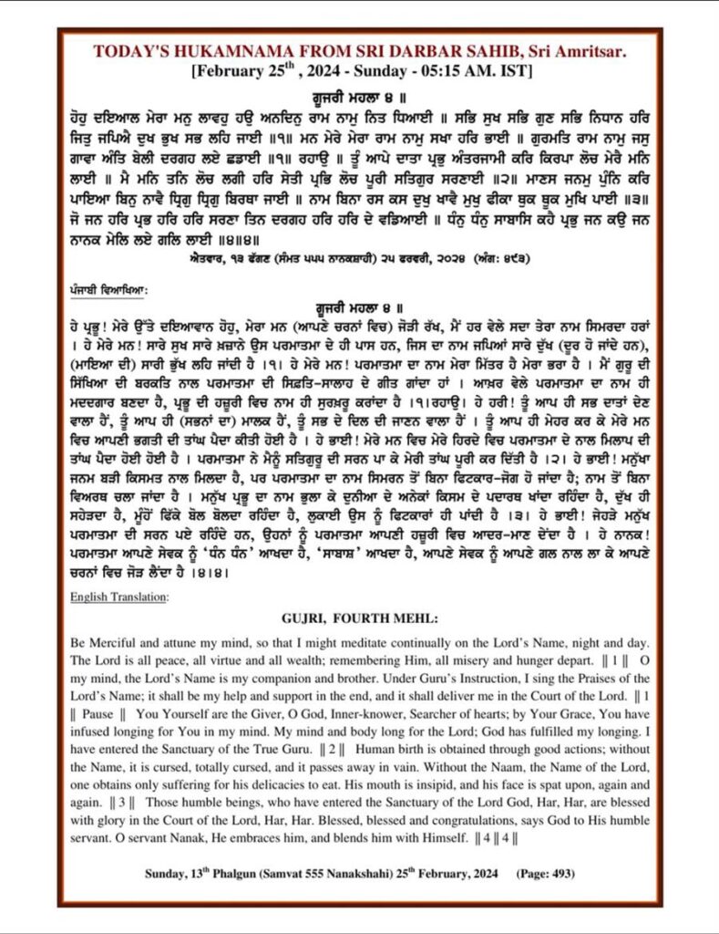 ਅੰਮ੍ਰਿਤ ਵੇਲੇ ਦਾ ਹੁਕਮਨਾਮਾ ਸ੍ਰੀ ਦਰਬਾਰ ਸਾਹਿਬ, ਅੰਮ੍ਰਿਤਸਰ, ਅੰਗ 493, ਮਿਤੀ 25-02-2024