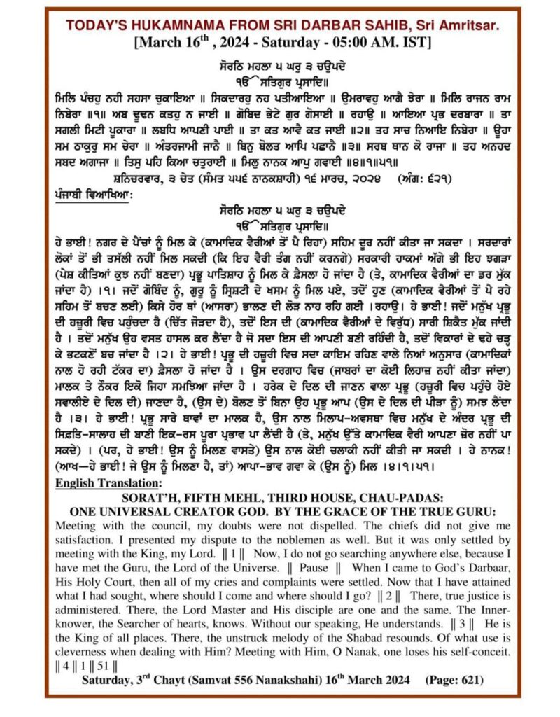 ਸੱਚਖੰਡ ਸ੍ਰੀ ਹਰਿਮੰਦਰ ਸਾਹਿਬ ਅੰਮ੍ਰਿਤਸਰ ਵੇਖੇ ਹੋਇ ਅੰਮ੍ਰਿਤ ਵੇਲੇ ਦਾ ਮੁਖਵਾਕ: 16-03-24