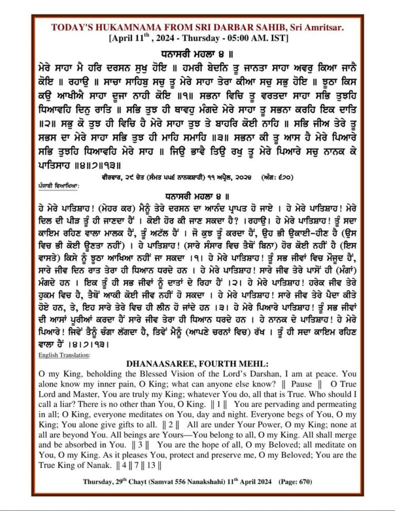 ਅੰਮ੍ਰਿਤ ਵੇਲੇ ਦਾ ਹੁਕਮਨਾਮਾ ਸ੍ਰੀ ਦਰਬਾਰ ਸਾਹਿਬ, ਅੰਮ੍ਰਿਤਸਰ, ਅੰਗ 670, ਮਿਤੀ 11-04-2024