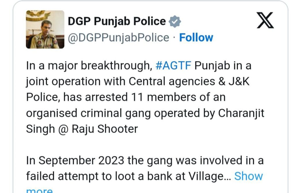 ਪੰਜਾਬ ਪੁਲਿਸ ਦੀ ਐਂਟੀ ਗੈਂਗਸਟਰ ਟਾਸਕ ਫੋਰਸ, ਕੇਂਦਰੀ ਏਜੰਸੀਆਂ ਅਤੇ ਜੰਮੂ-ਕਸ਼ਮੀਰ ਪੁਲਿਸ ਨੇ ਮਿਲ ਕੇ ਪੰਜਾਬ ਤੋਂ 11 ਦੋਸ਼ੀਆਂ ਨੂੰ ਗ੍ਰਿਫਤਾਰ ਕੀਤਾ ਹੈ। ਸਾਰੇ ਮੁਲਜ਼ਮ ਗੈਂਗਸਟਰ ਚਰਨਜੀਤ ਸਿੰਘ ਉਰਫ਼ ਰਾਜੂ ਸ਼ੂਟਰ ਦੇ ਸੰਗਠਿਤ ਗਰੋਹ ਦੇ ਮੈਂਬਰ ਹਨ। ਉਕਤ ਮੁਲਜ਼ਮਾਂ ਨੇ ਪਿਛਲੇ ਸਾਲ ਸਤੰਬਰ ਮਹੀਨੇ ਵਿੱਚ ਤਰਨਤਾਰਨ ਦੇ ਪਿੰਡ ਢੋਟੀਆਂ ਵਿੱਚ ਇੱਕ ਬੈਂਕ ਲੁੱਟਣ ਦੀ ਕੋਸ਼ਿਸ਼ ਕੀਤੀ ਸੀ। ਪਰ ਮੁਲਜ਼ਮਾਂ ਖ਼ਿਲਾਫ਼ ਕੁਝ ਨਹੀਂ ਮਿਲਿਆ।