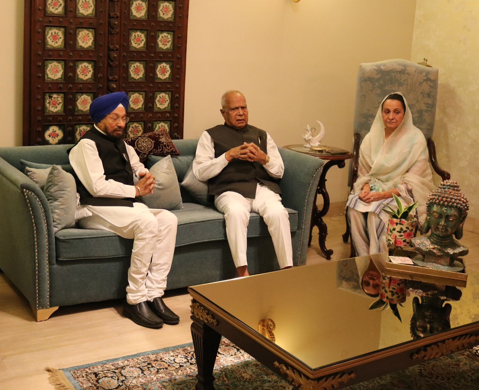 ਚੰਡੀਗੜ੍ਹ 3 ਮਈ,ਬੋਲੇ ਪੰਜਾਬ ਬਿਓਰੋ: ਭਾਜਪਾ ਦੀ ਰਾਸ਼ਟਰੀ ਕਾਰਜਕਰਨੀ ਮੈਂਬਰ ਅਮਨਜੋਤ ਕੌਰ ਰਾਮੂਵਾਲੀਆ ਨਾਲ ਉਹਨਾ ਦੀ ਚੰਡੀਗੜ ਰਿਹਾਇਸ਼ ਤੇ ਉਹਨਾਂ ਦੇ ਪਤੀ ਦੀ ਬੇਵਕਤੀ ਮੌਤ ਤੇ ਦੁੱਖ ਦਾ ਪ੍ਰਗਟਾਵਾ ਕਰਦੇ ਹੋਏ ਮਾਨਯੋਗ ਗਵਰਨਰ ਪੰਜਾਬ ਬਨਵਾਰੀ ਲਾਲ ਪ੍ਰੋਹਿਤ ਨੇ ਕਿਹਾ ਅਰਵਿੰਦਰ ਸਿੰਘ ਭੁੱਲਰ ਦੀ ਮੌਤ ਨੇ ਸਭ ਨੂੰ ਝੰਜੋੜ ਕੇ ਰੱਖ ਦਿੱਤਾ ਹੈ ਦੁੱਖ ਦੀ ਇਸ ਘੜੀ ਵਿੱਚ ਮੈਂ ਪਰਿਵਾਰ ਨਾਲ ਸੰਵੇਦਨਾ ਪਰਗਟ ਕਰਦਾ ਹਾਂ,ਪਰਮਾਤਮਾ ਵਿੱਛੜੀ ਰੂਹ ਨੂੰ ਆਪਣੇ ਚਰਨਾਂ ਵਿੱਚ ਨਿਵਾਸ ਬਖਸ਼ਣ ਤੇ ਪਰਿਵਾਰ ਨੂੰ ਭਾਣਾ ਮੰਨਣ ਦਾ ਬਲ ਬਖਸ਼ਣ ।ਗਵਰਨਰ ਪੰਜਾਬ ਬਨਵਾਰੀ ਲਾਲ ਪ੍ਰੋਹਿਤ ਦੇ ਨਾਲ ਬੀਬੀ ਅਮਨਜੋਤ ਕੌਰ ਰਾਮੂੰਵਾਲੀਆ ਸਾਬਕਾ ਕੇਂਦਰੀ ਮੰਤਰੀ ਬਲਵੰਤ ਸਿੰਘ ਰਾਮੂੰਵਾਲੀਆ ।
