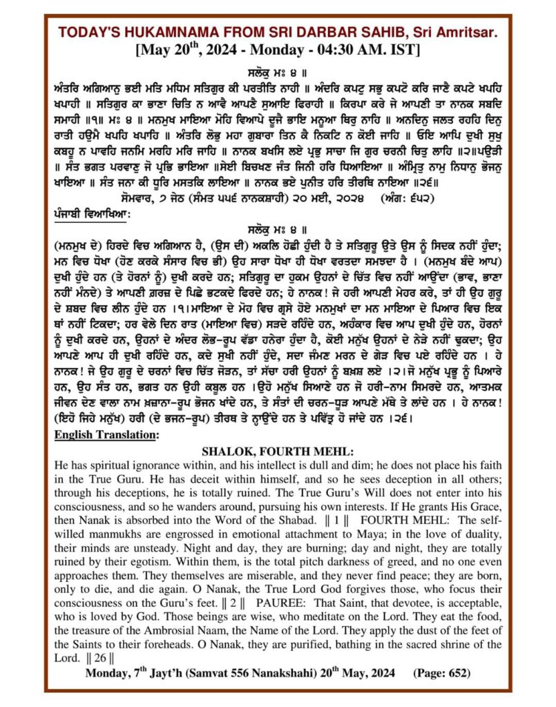 ਅੰਮ੍ਰਿਤ ਵੇਲੇ ਦਾ ਹੁਕਮਨਾਮਾ ਸ੍ਰੀ ਦਰਬਾਰ ਸਾਹਿਬ, ਅੰਮ੍ਰਿਤਸਰ, ਮਿਤੀ 20-05-2024 , ਅੰਗ 652