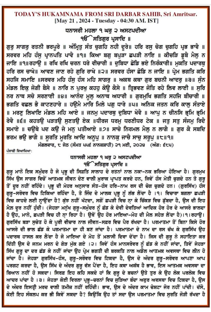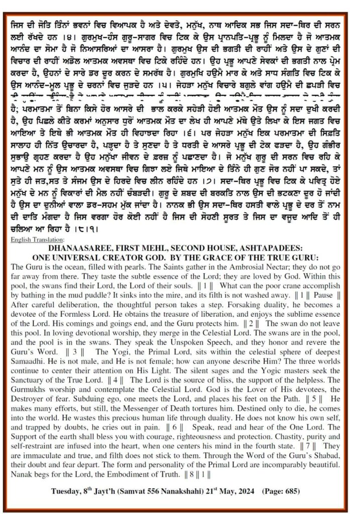 ਅੰਮ੍ਰਿਤ ਵੇਲੇ ਦਾ ਹੁਕਮਨਾਮਾ ਸ੍ਰੀ ਦਰਬਾਰ ਸਾਹਿਬ, ਅੰਮ੍ਰਿਤਸਰ ਅੰਗ 685, ਮਿਤੀ 21-05-2024