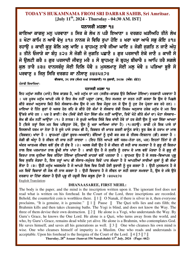 ਅੰਮ੍ਰਿਤ ਵੇਲੇ ਦਾ ਹੁਕਮਨਾਮਾ ਸ੍ਰੀ ਦਰਬਾਰ ਸਾਹਿਬ, ਅੰਮ੍ਰਿਤਸਰ, ਮਿਤੀ 11-07-24 ,ਅੰਗ 662