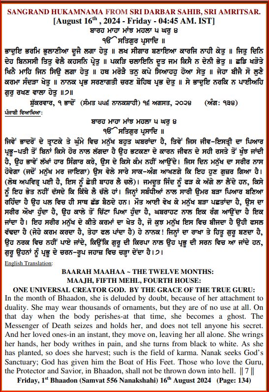 ਅੰਮ੍ਰਿਤ ਵੇਲੇ ਦਾ ਹੁਕਮਨਾਮਾ ਸ੍ਰੀ ਦਰਬਾਰ ਸਾਹਿਬ, ਅੰਮ੍ਰਿਤਸਰ, ਮਿਤੀ 16-08-2024.ਅੰਗ 639