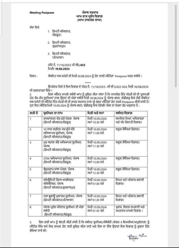 ਕੈਬਨਿਟ ਸਬ ਕਮੇਟੀ ਨੇ ਵੱਖ-ਵੱਖ ਮੁਲਾਜ਼ਮ ਯੂਨੀਅਨਾਂ ਦੀ ਬੁਲਾਈ ਮੀਟਿੰਗਾਂ postpone ਕੀਤੀਆਂ ਹਨ ਅਤੇ ਵੱਖ-ਵੱਖ ਮੁਲਾਜ਼ਮ ਯੂਨੀਅਨਾਂ ਦੀ 10 ਅਗਸਤ ਨੂੰ ਮੀਟਿੰਗ ਬੁਲਾਈ ਹੈ।