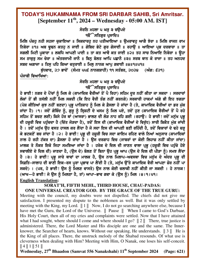 ਅੰਮ੍ਰਿਤ ਵੇਲੇ ਦਾ ਹੁਕਮਨਾਮਾ ਸ੍ਰੀ ਦਰਬਾਰ ਸਾਹਿਬ, ਅੰਮ੍ਰਿਤਸਰ, ਮਿਤੀ 11-09-24 ਅੰਗ 621