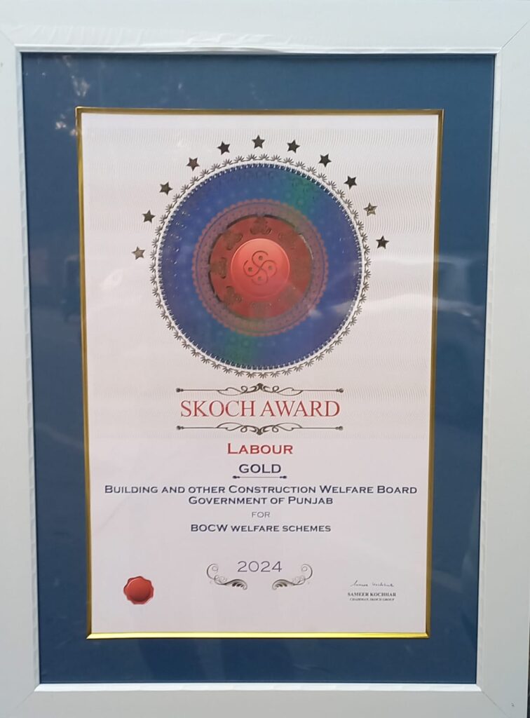 ਪੰਜਾਬ ਬਿਲਡਿੰਗ ਐਂਡ ਅਦਰ ਕੰਸਟਰਕਸ਼ਨ ਵਰਕਰਜ਼ ਵੈਲਫੇਅਰ ਬੋਰਡ, ਜੋ ਕਿ ਉਸਾਰੀ ਕਿਰਤੀਆਂ ਦੀ ਭਲਾਈ ਲਈ ਕੰਮ ਕਰਦਾ ਹੈ, ਨੇ ਪ੍ਰਸਿੱਧ ‘ਸਕੌਚ ਐਵਾਰਡ’ ਹਾਸਲ ਕੀਤਾ ਹੈ।