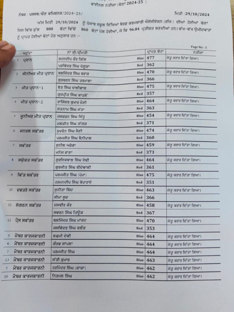 ਪੰਜਾਬ ਸਕੂਲ ਸਿੱਖਿਆ ਬੋਰਡ ਕਰਮਚਾਰੀ ਐਸੋਸੀਏਸ਼ਨ ਦੀਆਂ ਹੋਈਆਂ ਚੋਣਾਂ ਵਿਚ ਰਮਨਦੀਪ ਕੌਰ ਗਿੱਲ ਨੇ ਪਰਵਿੰਦਰ ਸਿੰਘ ਖੰਗੂੜਾ ਹਰਾ ਕੇ ਜਿੱਤ ਪ੍ਰਾਪਤ ਕੀਤੀ ਹੈ। ਰਮਨਦੀਪ ਕੌਰ ਗਿੱਲ 477 ਵੋਟਾਂ ਲੈ ਕੇ ਬੋਰਡ ਕਰਮਚਾਰੀ ਐਸੋਸੀਏਸ਼ਨ ਦੀ ਪ੍ਰਧਾਨ ਬਣ ਗਈ।ਸੀਨੀਅਰ ਮੀਤ ਪ੍ਰਧਾਨ ਬਲਜਿੰਦਰ ਸਿੰਘ ਬਰਾੜ, ਮੀਤ ਪ੍ਰਧਾਨ ਬੰਤ ਸਿੰਘ ਧਾਲੀਵਾਲ ਅਤੇ ਰਜਿੰਦਰ ਕੁਮਾਰ ਮੈਣੀ ਚੁਣੇ ਗਏ। ਜੂਨੀਅਰ ਮੀਤ ਪ੍ਰਧਾਨ ਜਸਕਰਨ ਸਿੰਘ ਸਿੱਧੂ ਚੁਣੇ ਗਏ। ਜਨਰਲ ਸਕੱਤਰ ਦੇ ਅਹੁਦੇ ‘ਤੇ ਸੁਖਚੈਨ ਸਿੰਘ ਸੈਣੀ, ਸਕੱਤਰ ਸੁਨੀਲ ਅਰੋੜਾ, ਸੰਯੁਕਤ ਸਕੱਤਰ ਗੁਰਇਕਬਾਲ ਸਿੰਘ ਸੋਢੀ, ਵਿਤ ਸਕੱਤਰ ਪਰਮਜੀਤ ਸਿੰਘ ਪੰਮਾ, ਦਫਤਰ ਸਕੱਤਰ ਸੁਨੀਤਾ ਥਿੰਦ, ਸੰਗਠਨ ਸਕੱਤਰ ਜਸਵੀਰ ਕੌਰ ਅਤੇ ਪ੍ਰੈਸ ਸਕੱਤਰ ਬਲਜਿੰਦਰ ਸਿੰਘ ਮਾਂਗਟ ਚੁਣੇ ਗਏ।