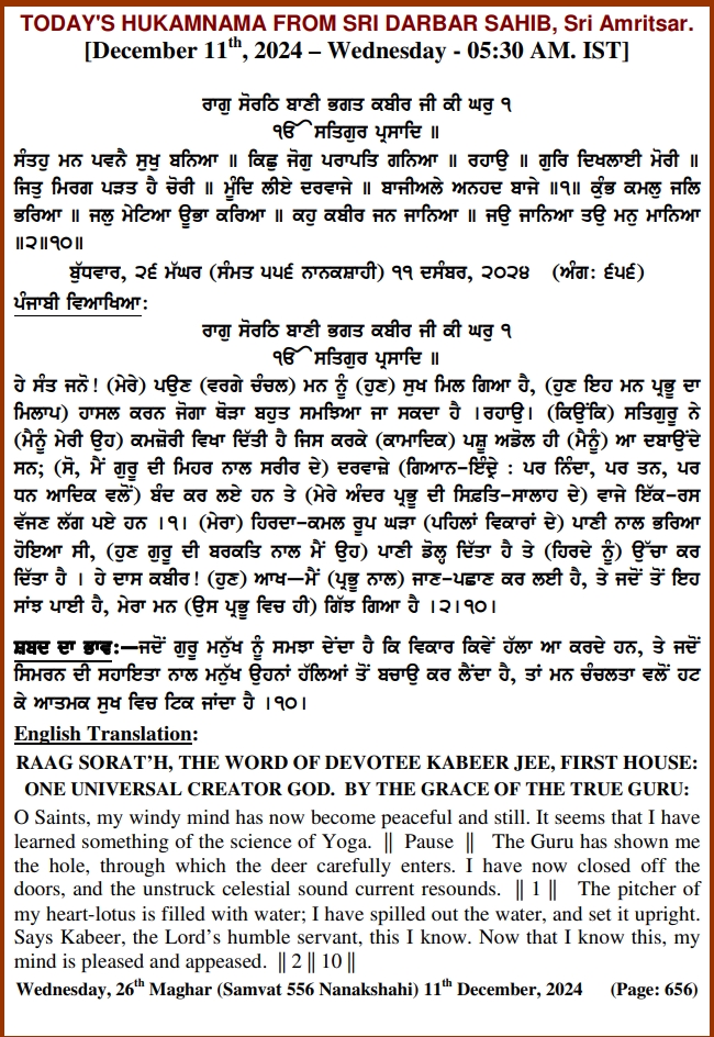 ਅੰਮ੍ਰਿਤ ਵੇਲੇ ਦਾ ਹੁਕਮਨਾਮਾ ਸ੍ਰੀ ਦਰਬਾਰ ਸਾਹਿਬ, ਅੰਮ੍ਰਿਤਸਰ, ਮਿਤੀ 11-12-2024.ਅੰਗ 656