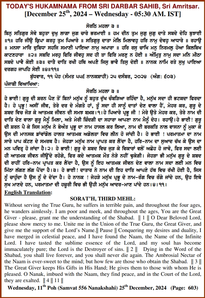 ਅੰਮ੍ਰਿਤ ਵੇਲੇ ਦਾ ਹੁਕਮਨਾਮਾ ਸ੍ਰੀ ਦਰਬਾਰ ਸਾਹਿਬ, ਅੰਮ੍ਰਿਤਸਰ, ਮਿਤੀ 25-12-2024 ਅੰਗ 603