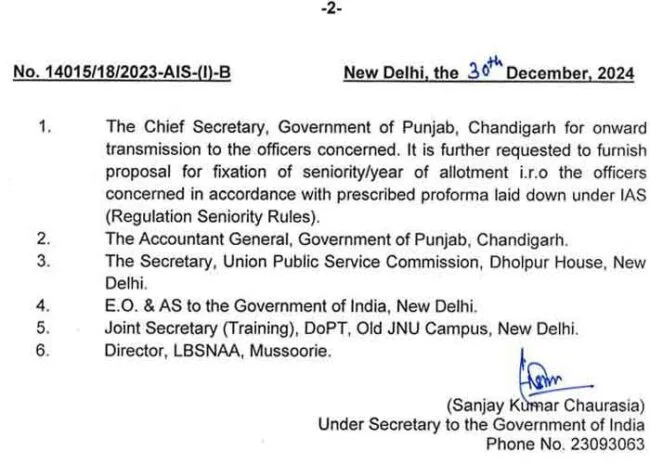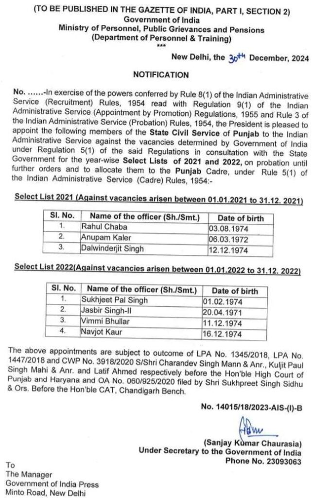 ਕੇਂਦਰ ਸਰਕਾਰ ਵਲੋਂ ਪੰਜਾਬ ਦੇ ਸੱਤ ਪੀਸੀਐੱਸ ਅਫ਼ਸਰਾਂ ਨੂੰ ਨਵੇਂ ਸਾਲ ਦਾ ਤੋਹਫ਼ਾ ਦਿੰਦੇ ਹੋਏ ਬਤੌਰ ਆਈਏਐੱਸ ਪਦਉਨਤ ਕਰ ਦਿੱਤਾ ਗਿਆ ਹੈ। ਕੇਂਦਰ ਸਰਕਾਰ ਦੇ ਮਨਿਸਟਰੀ ਆਫ ਪਰਸੋਨਲ, ਪਬਲਿਕ ਸ਼ਿਕਾਇਤਾਂ ਤੇ ਪੈਨਸ਼ਨ ਨੇ ਸੋਮਵਾਰ ਨੂੰ ਜਾਰੀ ਨੋਟੀਫਿਕੇਸ਼ਨ ’ਚ ਸਾਲ 2021 ਦੀ ਖਾਲੀ ਪੋਸਟ ’ਤੇ ਪੀਸੀਐੱਸ ਅਫ਼ਸਰ ਰਾਹੁਲ ਚੱਬਾ, ਅਨੁਪਮ ਕਲੇਰ, ਦਲਵਿੰਦਰਜੀਤ ਸਿੰਘ ਨੂੰ ਤੇ ਸਾਲ 2022 ਦੀਆਂ ਖਾਲੀ ਪੋਸਟਾਂ ’ਤੇ ਸੁਖਜੀਤ ਪਾਲ ਸਿੰਘ, ਜਸਬੀਰ ਸਿੰਘ (2) ਵਿੱਮੀ ਭੁੱਲਰ ਤੇ ਨਵਜੋਤ ਕੌਰ ਨੂੰ ਆਈਏਐੱਸ ਵਜੋਂ ਪਦਉਨਤ ਕੀਤਾ ਹੈ।