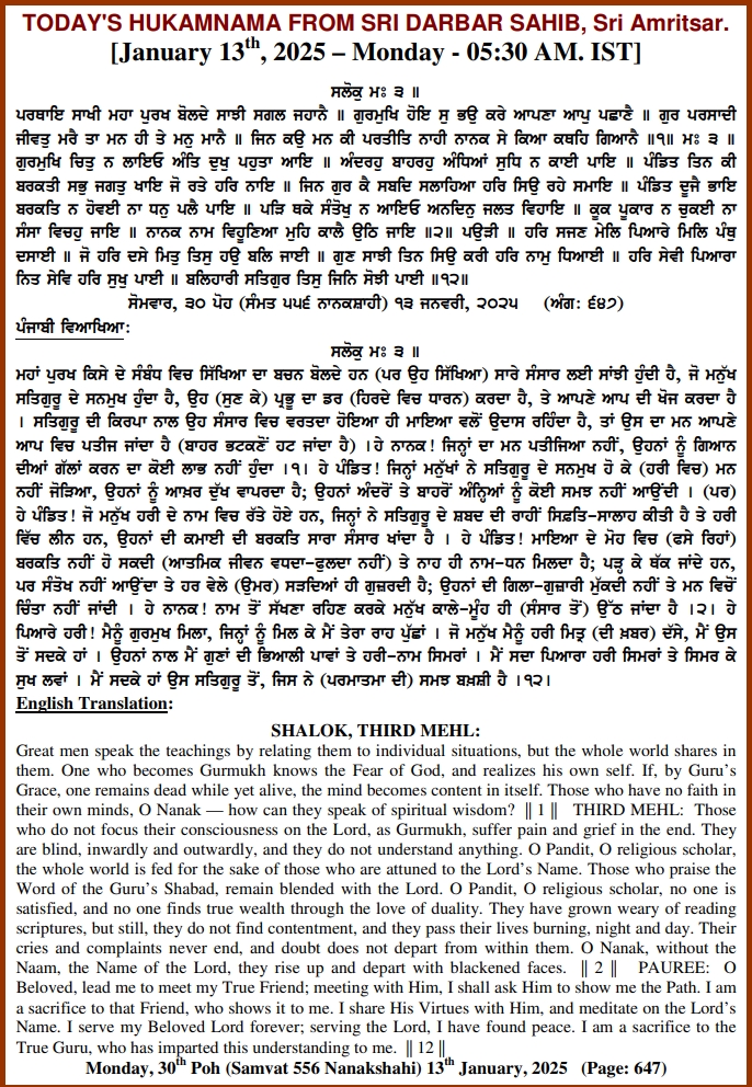ਅੰਮ੍ਰਿਤ ਵੇਲੇ ਦਾ ਹੁਕਮਨਾਮਾ ਸ੍ਰੀ ਦਰਬਾਰ ਸਾਹਿਬ, ਅੰਮ੍ਰਿਤਸਰ, ਮਿਤੀ 13-01-2025,ਅੰਗ 647
