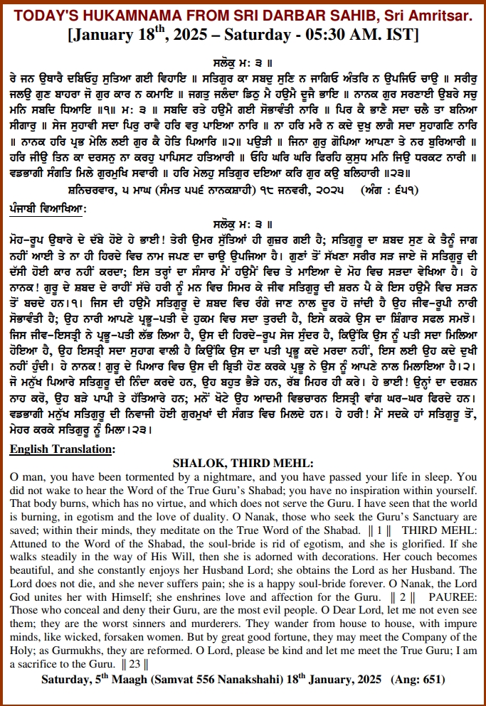 ਅੰਮ੍ਰਿਤ ਵੇਲੇ ਦਾ ਹੁਕਮਨਾਮਾ ਸ੍ਰੀ ਦਰਬਾਰ ਸਾਹਿਬ, ਅੰਮ੍ਰਿਤਸਰ, ਮਿਤੀ 18-01-2025 ,ਅੰਗ 651