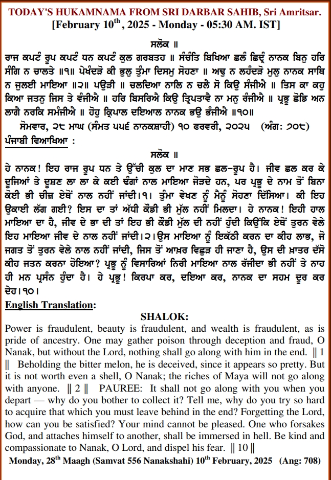 ਅੰਮ੍ਰਿਤ ਵੇਲੇ ਦਾ ਹੁਕਮਨਾਮਾ ਸ੍ਰੀ ਦਰਬਾਰ ਸਾਹਿਬ, ਅੰਮ੍ਰਿਤਸਰ, ਮਿਤੀ 10-02-2025,ਅੰਗ 708