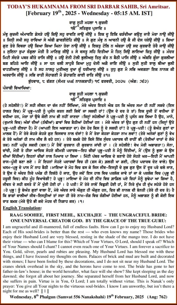 ਅੰਮ੍ਰਿਤ ਵੇਲੇ ਦਾ ਹੁਕਮਨਾਮਾ ਸ੍ਰੀ ਦਰਬਾਰ ਸਾਹਿਬ, ਅੰਮ੍ਰਿਤਸਰ, ਮਿਤੀ 19-02-2025,ਅੰਗ 762
