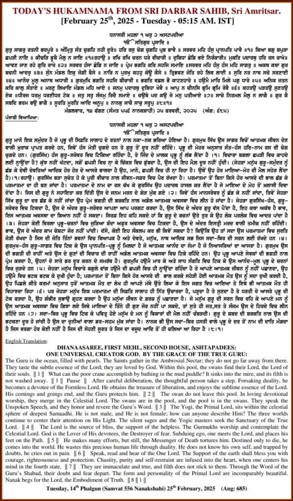 ਅੰਮ੍ਰਿਤ ਵੇਲੇ ਦਾ ਹੁਕਮਨਾਮਾ ਸ੍ਰੀ ਦਰਬਾਰ ਸਾਹਿਬ, ਅੰਮ੍ਰਿਤਸਰ, ਮਿਤੀ 25-02-2025,ਅੰਗ 685