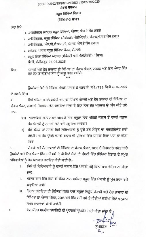 ਪੰਜਾਬ ਸਰਕਾਰ ਵੱਲੋਂ ਸੂਬੇ ਦੇ ਸਾਰੇ ਸਕੂਲਾਂ ਵਿੱਚ ਪੰਜਾਬੀ ਵਿਸ਼ਾ ਪੜ੍ਹਾਉਣ ਸਬੰਧੀ ਨੋਟੀਫਿਕੇਸ਼ਨ ਜਾਰੀ ਕੀਤਾ ਗਿਆ ਹੈ। ਪੰਜਾਬ ਸਰਕਾਰ ਵੱਲੋਂ ਸੂਬੇ ਦੇ ਸਾਰੇ ਸਕੂਲਾਂ, ਭਾਵੇਂ ਉਹ ਕਿਸੇ ਵੀ ਬੋਰਡ ਨਾਲ ਸਬੰਧਤ ਹੋਣ, ਲਈ ਪੰਜਾਬੀ ਨੂੰ ਮੁੱਖ ਤੇ ਲਾਜ਼ਮੀ ਵਿਸ਼ੇ ਵਜੋਂ ਪੜ੍ਹਾਉਣਾ ਲਾਜ਼ਮੀ ਕੀਤਾ ਗਿਆ ਹੈ। ਇਸ ਸਬੰਧੀ ਅੱਜ ਨੋਟੀਫ਼ਿਕੇਸ਼ਨ ਜਾਰੀ ਕੀਤਾ ਗਿਆ ਹੈ