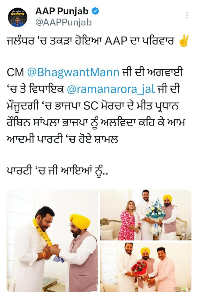 ਜਲੰਧਰ 23 ਅਪ੍ਰੈਲ, ਬੋਲੇ ਪੰਜਾਬ ਬਿਉਰੋ: ਭਾਜਪਾ SC ਮੋਰਚਾ ਦੇ ਮੀਤ ਪ੍ਰਧਾਨ ਰੋਬਿਨ ਸਾਂਪਲਾ ਆਮ ਆਦਮੀ ਪਾਰਟੀ ਵਿਚ ਸ਼ਾਮਲ ਹੋ ਗਏ ਹਨ।