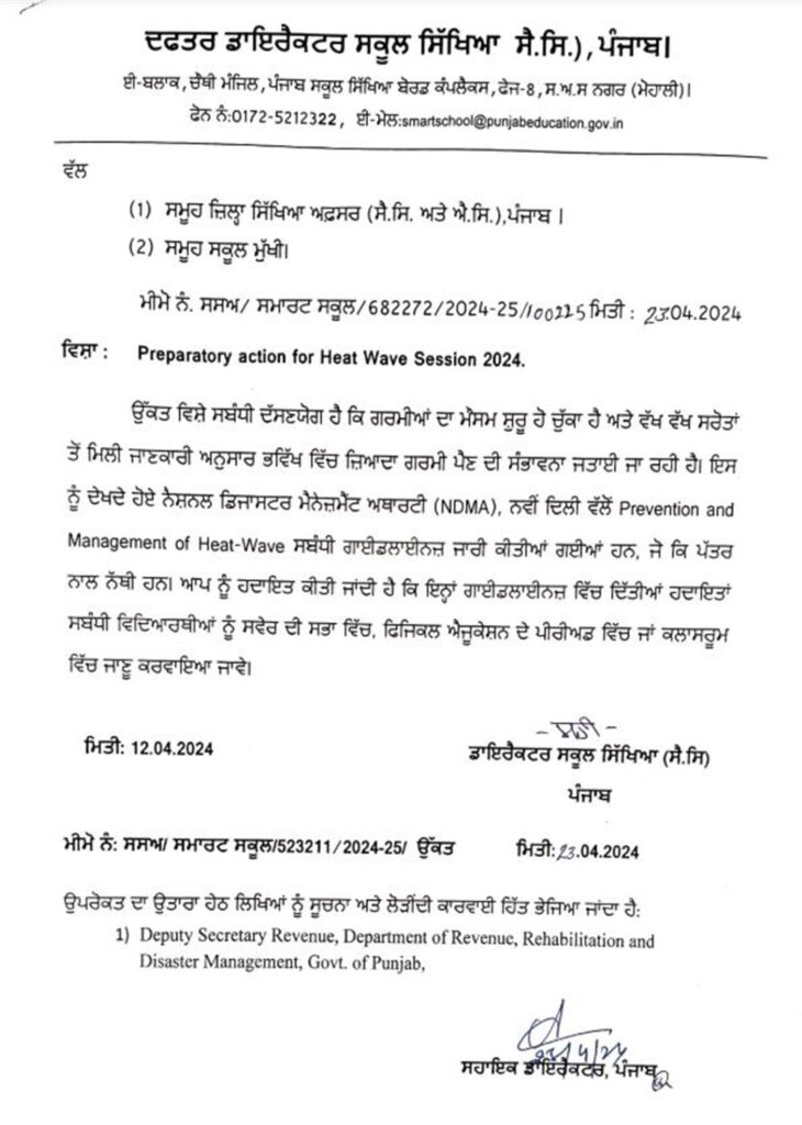 ਪੰਜਾਬ ‘ਚ ਵਧਦੀ ਗਰਮੀ ਦੇ ਮੱਦੇਨਜਰ ਸਿੱਖਿਆ ਵਿਭਾਗ ਵੱਲੋਂ ਸਕੂਲਾਂ ਨੂੰ ਦਿਸ਼ਾ ਨਿਰਦੇਸ਼ ਜਾਰੀ ਐਜੂਕੇਸ਼ਨ ਚੰਡੀਗੜ੍ਹ ਪੰਜਾਬ ਅਪ੍ਰੈਲ 23, 2024ਅਪ੍ਰੈਲ 23, 2024BolePunjab.comLeave a Comment on ਪੰਜਾਬ ‘ਚ ਵਧਦੀ ਗਰਮੀ ਦੇ ਮੱਦੇਨਜਰ ਸਿੱਖਿਆ ਵਿਭਾਗ ਵੱਲੋਂ ਸਕੂਲਾਂ ਨੂੰ ਦਿਸ਼ਾ ਨਿਰਦੇਸ਼ ਜਾਰੀ ਮੋਹਾਲੀ, 23 ਅਪ੍ਰੈਲ,ਬੋਲੇ ਪੰਜਾਬ ਬਿਓਰੋ:ਸਿੱਖਿਆ ਵਿਭਾਗ ਵੱਲੋਂ ਗਰਮੀ ਜ਼ਿਆਦਾ ਪੈਣ ਦੀ ਸੰਭਾਵਨਾ ਦੇ ਮੱਦੇਨਜਰ ਸਮੂਹ ਸਕੂਲਾਂ ਨੂੰ ਹੁਕਮ ਜਾਰੀ ਕੀਤੇ ਗਏ ਹਨ। ਸਿੱਖਿਆ ਵਿਭਾਗ ਨੇ ਇਸ ਸੰਬੰਧੀ ਨੈਸ਼ਨਲ ਡਿਜਾਸਟਰ ਮੈਨੇਜ਼ਮੈਂਟ ਅਥਾਰਿਟੀ ਵੱਲੋਂ ਜਾਰੀ ਗਾਈਡਲਾਈਨਜ਼ ਦੀ ਪਾਲਣਾ ਕਰਨ ਲਈ ਪੱਤਰ ਜਾਰੀ ਕੀਤਾ ਹੈ। Related Postਪੰਜਾਬ ਸਕੂਲ ਸਿੱਖਿਆ ਬੋਰਡ ਦੇ ਭਿਆਨਕ ਵਿੱਤੀ ਸੰਕਟ ਸਬੰਧੀ ਜਥੇਬੰਦੀ ਵੱਲੋਂ ਸਰਕਾਰ ਨੂੰ ਤੁਰੰਤ ਧਿਆਨ ਦੇਣ ਲਈ ਅਪੀਲਨਵੰਬਰ 24, 2025ਸੀਜੀਸੀ ਯੂਨੀਵਰਸਿਟੀ, ਮੋਹਾਲੀ ਨੇ ਵੈਂਚਰਵਾਲਟ ਸੀਜ਼ਨ 2 ਰਾਹੀਂ ਨਵੀਂ ਸੋਚ ਨੂੰ ਦਿੱਤੀ ਉਡਾਨਅਕਤੂਬਰ 29, 2025ਪੰਜਾਬ ਸਰਕਾਰ 71 ਅਧਿਆਪਕਾਂ ਦਾ ਵੱਕਾਰੀ ਰਾਜ ਅਧਿਆਪਕ ਪੁਰਸਕਾਰ ਨਾਲ ਕਰੇਗੀ ਸਨਮਾਨ: ਹਰਜੋਤ ਬੈਂਸਅਕਤੂਬਰ 4, 2025Latest Newsਪੰਜਾਬ ਨੇ ਸਕੂਲ ਅਧਿਆਪਕਾਂ ਨੂੰ ਕਰੀਅਰ ਮੈਂਟਰ ਵਜੋਂ ਸਿਖਲਾਈ ਦੇਣ ਲਈ ਆਈ.ਆਈ.ਟੀ. ਮਦਰਾਸ ਨਾਲ ਹੱਥ ਮਿਲਾਇਆਸੰਸਦ ਮੈਂਬਰ ਸ਼੍ਰੀ ਮਨੀਸ਼ ਤਿਵਾੜੀ ਨੇ ਲੋਕ ਸਭਾ ਵਿੱਚ ਹਰਿਆਣਾ, ਪੰਜਾਬ ਅਤੇ ਹਿਮਾਚਲ ਪ੍ਰਦੇਸ਼ ਦੇ ਡੈਮਾਂ ਦੀ ਡੀ-ਸਿਲਟਿੰਗ ਅਤੇ ਘਟਦੀ ਸਟੋਰੇਜ ਸਮਰੱਥਾ ਦਾ ਮੁੱਦਾ ਉਠਾਇਆਮੁੱਖ ਪ੍ਰਸ਼ਾਸ਼ਕ ਪੁੱਡਾ ਮੈਡਮ ਨੀਰੂ ਕਤਿਆਲ ਗੁਪਤਾ ਦੇ ਦਫਤਰ ਪੁੱਡਾ ਭਵਨ ਮੋਹਾਲੀ ਵਿਖੇ ਲੜੀਵਾਰ ਭੁੱਖ ਹੜਤਾਲਪੰਜਾਬ ਵਿੱਚ ਜ਼ਿਲ੍ਹਾ ਪ੍ਰੀਸ਼ਦ ਚੋਣਾਂ ਨੂੰ ਲੈ ਕੇ ਕਾਂਗਰਸ ਨੇ ਹਾਈ ਕੋਰਟ ਦਾ ਦਰਵਾਜ਼ਾ ਖੜਕਾਇਆਬਿਜਲੀ ਸੋਧ ਬਿਲ ਤੇ ਨਵੇਂ ਬੀਜ ਬਿੱਲ ਖਿਲਾਫ ਕਿਰਤੀ ਕਿਸਾਨ ਮੋਰਚਾ ਦੀ ਹੋਈ ਮੀਟਿੰਗPreviousNextLatest Newsਪੰਜਾਬ ਨੇ ਸਕੂਲ ਅਧਿਆਪਕਾਂ ਨੂੰ ਕਰੀਅਰ ਮੈਂਟਰ ਵਜੋਂ ਸਿਖਲਾਈ ਦੇਣ ਲਈ ਆਈ.ਆਈ.ਟੀ. ਮਦਰਾਸ ਨਾਲ ਹੱਥ ਮਿਲਾਇਆਸੰਸਦ ਮੈਂਬਰ ਸ਼੍ਰੀ ਮਨੀਸ਼ ਤਿਵਾੜੀ ਨੇ ਲੋਕ ਸਭਾ ਵਿੱਚ ਹਰਿਆਣਾ, ਪੰਜਾਬ ਅਤੇ ਹਿਮਾਚਲ ਪ੍ਰਦੇਸ਼ ਦੇ ਡੈਮਾਂ ਦੀ ਡੀ-ਸਿਲਟਿੰਗ ਅਤੇ ਘਟਦੀ ਸਟੋਰੇਜ ਸਮਰੱਥਾ ਦਾ ਮੁੱਦਾ ਉਠਾਇਆਮੁੱਖ ਪ੍ਰਸ਼ਾਸ਼ਕ ਪੁੱਡਾ ਮੈਡਮ ਨੀਰੂ ਕਤਿਆਲ ਗੁਪਤਾ ਦੇ ਦਫਤਰ ਪੁੱਡਾ ਭਵਨ ਮੋਹਾਲੀ ਵਿਖੇ ਲੜੀਵਾਰ ਭੁੱਖ ਹੜਤਾਲਪੰਜਾਬ ਵਿੱਚ ਜ਼ਿਲ੍ਹਾ ਪ੍ਰੀਸ਼ਦ ਚੋਣਾਂ ਨੂੰ ਲੈ ਕੇ ਕਾਂਗਰਸ ਨੇ ਹਾਈ ਕੋਰਟ ਦਾ ਦਰਵਾਜ਼ਾ ਖੜਕਾਇਆਬਿਜਲੀ ਸੋਧ ਬਿਲ ਤੇ ਨਵੇਂ ਬੀਜ ਬਿੱਲ ਖਿਲਾਫ ਕਿਰਤੀ ਕਿਸਾਨ ਮੋਰਚਾ ਦੀ ਹੋਈ ਮੀਟਿੰਗਪਾਈਟੈਕਸ ਵਿਖੇ ਅਪਾਹਜਾਂ ਅਤੇ ਬਜ਼ੁਰਗਾਂ ਲਈ ਵ੍ਹੀਲਚੇਅਰ ਦੀ ਸਹੂਲਤਚੰਡੀਗੜ੍ਹ ਪੁਲਿਸ ਦੇ ਸ਼ਰਾਬੀ ASI ਨੇ 10 ਵਾਹਨਾਂ ਨੂੰ ਮਾਰੀ ਟੱਕਰਪੰਜਾਬ ਵਿੱਚ ਰੇਲਵੇ ਪਟੜੀਆਂ ‘ਤੇ ਕਿਸਾਨਾਂ ਅਤੇ ਪੁਲਿਸ ਵਿਚਕਾਰ ਝੜਪਾਂਦੇਸ਼ ਭਗਤ ਯੂਨੀਵਰਸਿਟੀ ਨੇ ਕਰਵਾਈ ਅੰਤਰਰਾਸ਼ਟਰੀ ਕਾਨਫਰੰਸ ਅਤੇ ਅਗਾਂਹਵਧੂ ਕਿਸਾਨ ਮਿਲਣੀਆਮ ਆਦਮੀ ਪਾਰਟੀ ਵੱਲੋਂ ਨਾਮਜ਼ਦਗੀ ਪੱਤਰ ਦਾਖਲ ਕਰਨ ਦੌਰਾਨ ਸ਼ਰੇਆਮ ਗੁੰਡਾਗਰਦੀ ਦੀਆਂ ਘਟਨਾਵਾਂ ਅਤੇ ਚੋਣ ਪ੍ਰਕਿਰਿਆ ਦੌਰਾਨ ਸਰਕਾਰੀ ਮਸ਼ੀਨਰੀ ਦੀ ਕਥਿਤ ਦੁਰਵਰਤੋਂ ਲੋਕਤੰਤਰ ਲਈ ਖ਼ਤਰਨਾਕ – ਕੈਂਥ ਪੁਲਿਸ ਮੁਲਾਜ਼ਮਾਂ ‘ਤੇ ਵਰਦੀ ‘ਚ ਰੀਲਾਂ ਬਣਾਉਣ ‘ਤੇ ਲੱਗੀ ਪਾਬੰਦੀਜਲੰਧਰ ‘ਚ ਰੋਡਵੇਜ਼ ਬੱਸ ਨੇ ਸਕੂਟਰ ਨੂੰ ਟੱਕਰ ਮਾਰੀ, ਪੁੱਤ ਦੀ ਮੌਤ ਪਿਤਾ ਗੰਭੀਰ ਜ਼ਖ਼ਮੀ PreviousNext