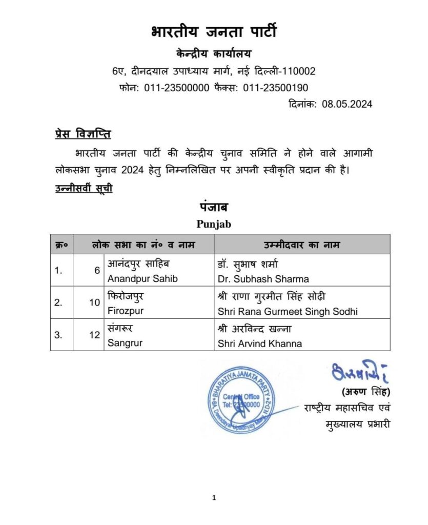 ਚੰਡੀਗੜ੍ਹ 8 ਮਈ,ਬੋਲੇ ਪੰਜਾਬ ਬਿਓਰੋ: ਭਾਜਪਾ ਨੇ ਵੱਖ ਵੱਖ ਜਿਲ੍ਹਿਆਂ ਤੋਂ ਤਿੰਨ ਹੋਰ ਉਮੀਦਵਾਰ ਐਲਾਨੇ ਹਨ।