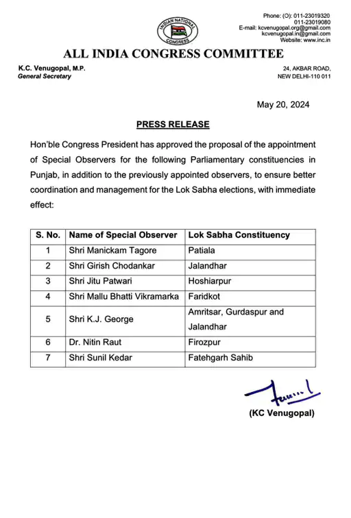 ਕਾਂਗਰਸ ਨੇ ਲੋਕ ਸਭਾ ਹਲਕਿਆਂ ‘ਤੇ ਸਪੈਸ਼ਲ ਅਬਜ਼ਰਵਰਾਂ ਦੀ ਕੀਤੀ ਨਿਯੁਕਤੀ
