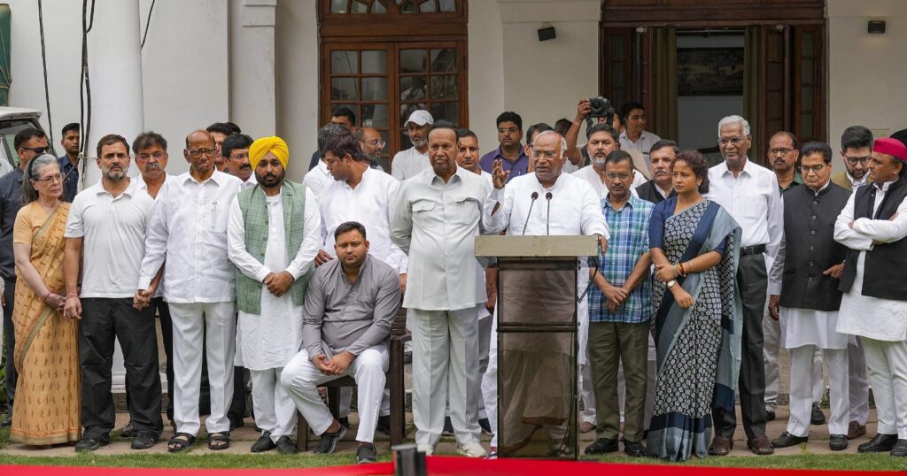 ਖੜਗੇ ਨੇ ਮੀਡੀਆ ਨੂੰ ਕਿਹਾ, ‘ਅਸੀਂ ਇਕਜੁੱਟ ਹਾਂ, ਤੁਸੀਂ ਸਾਨੂੰ ਕਿਉਂ ਵੰਡ ਰਹੇ ਹੋ। ਅਸੀਂ ਸਾਰੇ ਇਕੱਠੇ ਹਾਂ। ਅਸੀਂ ਇੱਕ ਹਾਂ, ਇੱਕ ਰਹਾਂਗੇ, ਸਾਨੂੰ ਵੰਡਣ ਦੀ ਕੋਸ਼ਿਸ਼ ਨਾ ਕਰੋ। ਦੱਸਣਯੋਗ ਹੈ ਕਿ ਇੰਡੀਆ ਗੱਠਜੋੜ ਦੀ ਮੀਟਿੰਗ ਵਿੱਚ 23 ਆਗੂ ਸ਼ਾਮਲ ਹੋਏ ਜਦਕਿ ਮਮਤਾ ਬੈਨਰਜੀ ਸ਼ਾਮਲ ਨਹੀਂ ਹੋਈ।