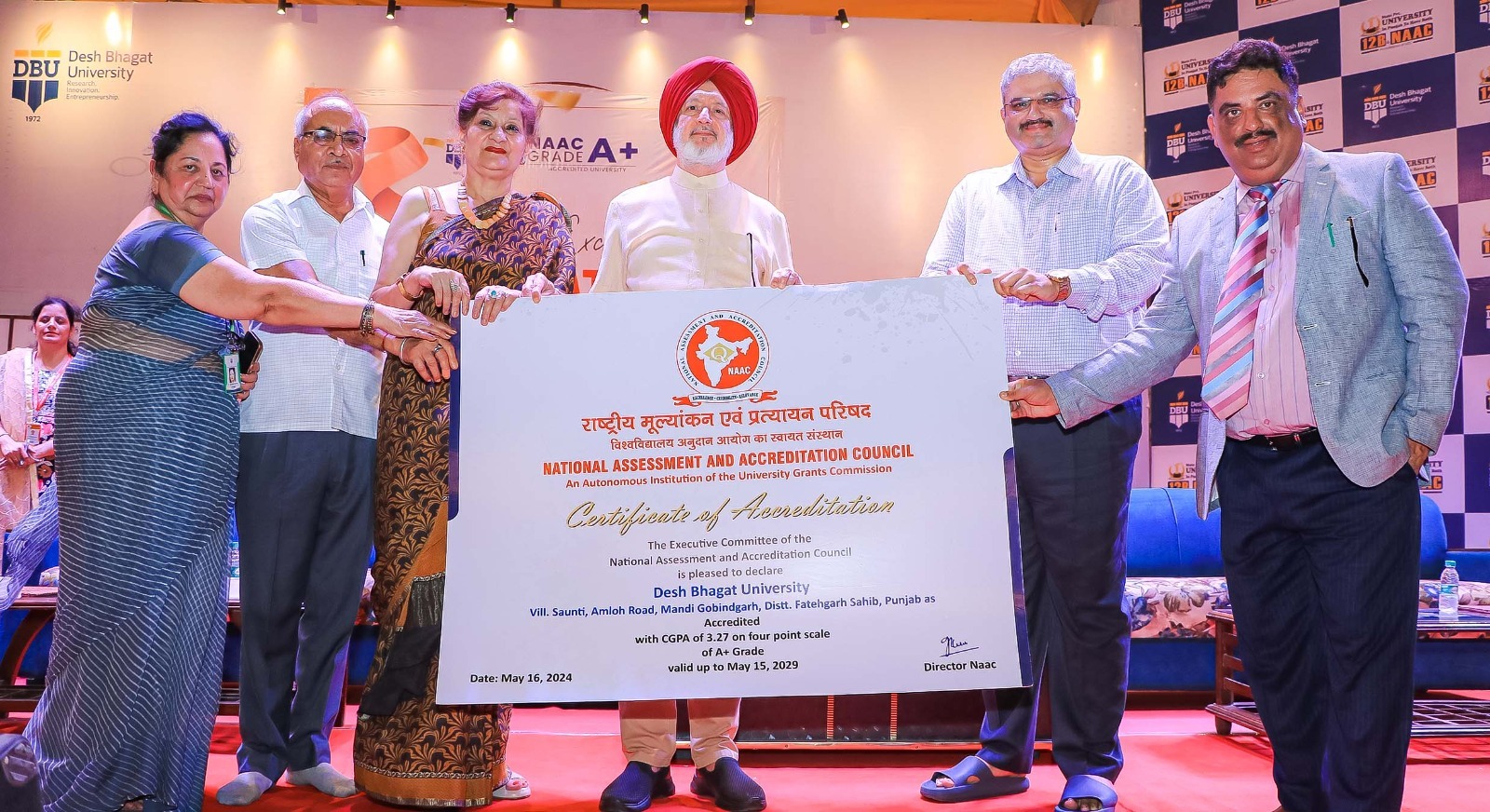 ਦੇਸ਼ ਭਗਤ ਯੂਨੀਵਰਸਿਟੀ (ਡੀਬੀਯੂ) ਇੱਕ ਸ਼ਾਨਦਾਰ ਸਨਮਾਨ ਸਮਾਰੋਹ ਦੇ ਨਾਲ ਨੈਕ (ਨੈਸ਼ਨਲ ਅਸੈਸਮੈਂਟ ਐਂਡ ਐਕਰੀਡੀਟੇਸ਼ਨ ਕੌਂਸਲ) ਗ੍ਰੇਡ ਏ + ਸਰਟੀਫਿਕੇਟ ਦੀ ਪ੍ਰਾਪਤੀ ਦਾ ਜਸ਼ਨ ਮਨਾਉਂਦੇ ਹੋਏ ਇੱਕ ਮਹੱਤਵਪੂਰਨ ਮੌਕੇ ਦਾ ਐਲਾਨ ਕਰਦੇ ਹੋਏ ਖੁਸ਼ ਹੈ। ਇਹ ਵੱਕਾਰੀ ਮਾਨਤਾ ਅਕਾਦਮਿਕ ਉੱਤਮਤਾ ਅਤੇ ਸੰਸਥਾਗਤ ਵਿਕਾਸ ਲਈ ਯੂਨੀਵਰਸਿਟੀ ਦੀ ਵਚਨਬੱਧਤਾ ਨੂੰ ਦਰਸਾਉਂਦੀ ਹੈ।