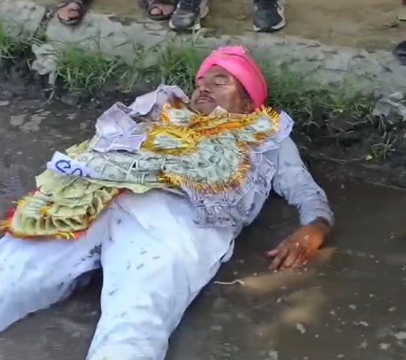 ਆਜ਼ਾਦ ਉਮੀਦਵਾਰ ਸਿਰ ‘ਤੇ ਲਾੜ੍ਹੇ ਵਾਲੀ ਟੋਪੀ ਲੈ ਕੇ ਗਲੇ ‘ਚ ਕਰੰਸੀ ਨੋਟਾਂ ਦਾ ਹਾਰ ਪਾ ਕੇ ਬੈਠਾ ਸੀ, ਜਿਸ ਦੀਆਂ ਤਸਵੀਰਾਂ ਹੁਣ ਸ਼ੋਸਲ ਮੀਡੀਆ ‘ਤੇ ਵਾਇਰਲ ਹੋ ਰਹੀਆਂ ਹਨ।