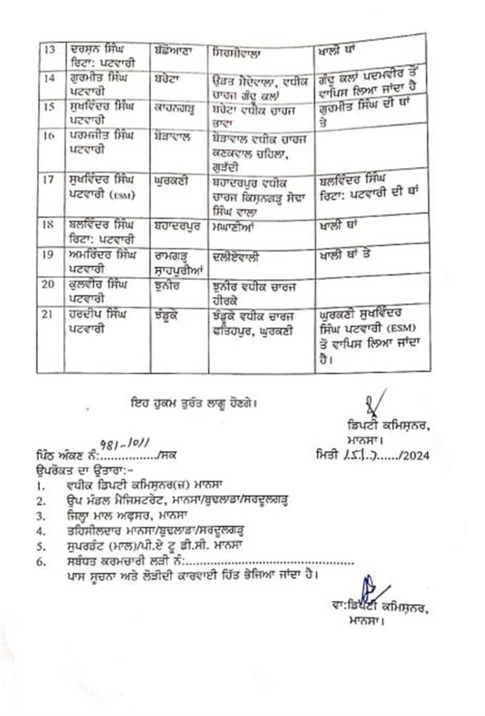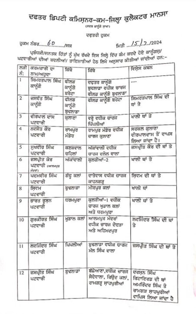 ਕਾਨੂੰਨਗੋਆਂ ਤੇ ਪਟਵਾਰੀਆਂ ਦੀਆਂ ਬਦਲੀਆਂ ਤੇ ਤਾਇਨਾਤੀਆਂ ਚੰਡੀਗੜ੍ਹ ਪੰਜਾਬ ਜੁਲਾਈ 16, 2024ਜੁਲਾਈ 16, 2024BolePunjab.comLeave a Comment on ਕਾਨੂੰਨਗੋਆਂ ਤੇ ਪਟਵਾਰੀਆਂ ਦੀਆਂ ਬਦਲੀਆਂ ਤੇ ਤਾਇਨਾਤੀਆਂ ਮਾਨਸਾ, 16 ਜੁਲਾਈ, ਬੋਲੇ ਪੰਜਾਬ ਬਿਊਰੋ : ਮਾਨਸਾ ਜ਼ਿਲ੍ਹੇ ਵਿੱਚ 21 ਕਾਨੂੰਨਗੋਆਂ ਤੇ ਪਟਵਾਰੀਆਂ ਦੀਆਂ ਬਦਲੀਆਂ ਤੇ ਤਾਇਨਾਤੀਆਂ ਕੀਤੀਆਂ ਗਈਆਂ ਹਨ। Related Postਮੋਗਾ : ਜ਼ਮੀਨੀ ਵਿਵਾਦ ਕਾਰਨ ਤਾਏ ਨੇ ਭਤੀਜੇ ਨੂੰ ਗੋਲੀਆਂ ਮਾਰ ਕੇ ਮਾਰਿਆ, ਕਾਰ ਉੱਤੇ ਚੜ੍ਹਾਈ ਦਸੰਬਰ 6, 2025ਲੁਧਿਆਣਾ ‘ਚ 22 ਕੈਰੇਟ ਦੱਸ ਕੇ ਘੱਟ ਸ਼ੁੱਧਤਾ ਦਾ ਸੋਨਾ ਵੇਚਣ ‘ਤੇ ਕਲਿਆਣ ਜਵੈਲਰਜ਼ ਨੂੰ ₹1 ਲੱਖ ਦਾ ਜੁਰਮਾਨਾ ਦਸੰਬਰ 6, 2025ਟ੍ਰਿਬਿਊਨਲ ਵਲੋਂ ਰਾਹਤ, ਪੋਰਟਲ ‘ਤੇ ਵਕਫ਼ ਜਾਇਦਾਦਾਂ ਰਜਿਸਟਰ ਕਰਨ ਦੀ ਆਖਰੀ ਮਿਤੀ ਦੋ ਮਹੀਨੇ ਵਧੀਦਸੰਬਰ 6, 2025Latest Newsਮੋਗਾ : ਜ਼ਮੀਨੀ ਵਿਵਾਦ ਕਾਰਨ ਤਾਏ ਨੇ ਭਤੀਜੇ ਨੂੰ ਗੋਲੀਆਂ ਮਾਰ ਕੇ ਮਾਰਿਆ, ਕਾਰ ਉੱਤੇ ਚੜ੍ਹਾਈ ਲੁਧਿਆਣਾ ‘ਚ 22 ਕੈਰੇਟ ਦੱਸ ਕੇ ਘੱਟ ਸ਼ੁੱਧਤਾ ਦਾ ਸੋਨਾ ਵੇਚਣ ‘ਤੇ ਕਲਿਆਣ ਜਵੈਲਰਜ਼ ਨੂੰ ₹1 ਲੱਖ ਦਾ ਜੁਰਮਾਨਾ ਟ੍ਰਿਬਿਊਨਲ ਵਲੋਂ ਰਾਹਤ, ਪੋਰਟਲ ‘ਤੇ ਵਕਫ਼ ਜਾਇਦਾਦਾਂ ਰਜਿਸਟਰ ਕਰਨ ਦੀ ਆਖਰੀ ਮਿਤੀ ਦੋ ਮਹੀਨੇ ਵਧੀਚੰਡੀਗੜ੍ਹ ਤੇ ਅੰਮ੍ਰਿਤਸਰ ਹਵਾਈ ਅੱਡਿਆਂ ‘ਤੇ ਇੰਡੀਗੋ ਉਡਾਣਾਂ ਰੱਦ ਹੋਣ ਕਾਰਨ ਯਾਤਰੀ ਪਰੇਸ਼ਾਨਸਾਬਕਾ ਮੰਤਰੀ ਮਾਸਟਰ ਤਾਰਾ ਸਿੰਘ ਲਾਡਲ ਦਾ ਦੇਹਾਂਤPreviousNextLatest Newsਮੋਗਾ : ਜ਼ਮੀਨੀ ਵਿਵਾਦ ਕਾਰਨ ਤਾਏ ਨੇ ਭਤੀਜੇ ਨੂੰ ਗੋਲੀਆਂ ਮਾਰ ਕੇ ਮਾਰਿਆ, ਕਾਰ ਉੱਤੇ ਚੜ੍ਹਾਈ ਲੁਧਿਆਣਾ ‘ਚ 22 ਕੈਰੇਟ ਦੱਸ ਕੇ ਘੱਟ ਸ਼ੁੱਧਤਾ ਦਾ ਸੋਨਾ ਵੇਚਣ ‘ਤੇ ਕਲਿਆਣ ਜਵੈਲਰਜ਼ ਨੂੰ ₹1 ਲੱਖ ਦਾ ਜੁਰਮਾਨਾ ਟ੍ਰਿਬਿਊਨਲ ਵਲੋਂ ਰਾਹਤ, ਪੋਰਟਲ ‘ਤੇ ਵਕਫ਼ ਜਾਇਦਾਦਾਂ ਰਜਿਸਟਰ ਕਰਨ ਦੀ ਆਖਰੀ ਮਿਤੀ ਦੋ ਮਹੀਨੇ ਵਧੀਚੰਡੀਗੜ੍ਹ ਤੇ ਅੰਮ੍ਰਿਤਸਰ ਹਵਾਈ ਅੱਡਿਆਂ ‘ਤੇ ਇੰਡੀਗੋ ਉਡਾਣਾਂ ਰੱਦ ਹੋਣ ਕਾਰਨ ਯਾਤਰੀ ਪਰੇਸ਼ਾਨਸਾਬਕਾ ਮੰਤਰੀ ਮਾਸਟਰ ਤਾਰਾ ਸਿੰਘ ਲਾਡਲ ਦਾ ਦੇਹਾਂਤਰਾਜ ਭਵਨ ਦਾ ਨਾਂ ਬਦਲ ਕੇ ਲੋਕ ਭਵਨ ਪੰਜਾਬ ਹੋਇਆਜਨਤਕ ਰੈਲੀ ਦੌਰਾਨ ‘ਆਪ’ ਵਿਧਾਇਕ ‘ਤੇ ਜੁੱਤੀ ਸੁੱਟੀ ਪੰਜਾਬ ‘ਚ ਸਵੇਰ-ਸ਼ਾਮ ਦੀ ਠੰਢ ਵਧੀ, ਘੱਟੋ-ਘੱਟ ਤਾਪਮਾਨ 2 ਡਿਗਰੀ ਹੋਇਆ, ਸ਼ੀਤ ਲਹਿਰ ਦਾ ਅਲਰਟਹਿਮਾਚਲ ਪ੍ਰਦੇਸ ‘ਚ ਰਾਤੀਂ ਆਇਆ ਭੂਚਾਲ, ਲੋਕ ਘਰਾਂ ‘ਚੋਂ ਬਾਹਰ ਨਿਕਲੇ IndiGo ਦੇ ਸੰਚਾਲਨ ‘ਚ ਅੱਜ ਵੀ ਸੁਧਾਰ ਦੇ ਸੰਕੇਤ ਨਹੀਂ, 4 ਦਿਨਾਂ ‘ਚ 2,000 ਤੋਂ ਵੱਧ ਉਡਾਣਾਂ ਕੈਂਸਲਕਾਂਗਰਸ ‘ਚ ਅਸਤੀਫਾ ਨਹੀਂ ਮੰਗਦੇ ਨਵੇਂ ਪ੍ਰਧਾਨ ਦਾ ਐਲਾਨ ਕਰਦੇ ਹਨ : ਰਾਜਾ ਵੜਿੰਗਭਾਰਤ ਤੇ ਰੂਸ ਵਿਚਾਲੇ 19 ਵੱਡੇ ਸਮਝੌਤੇ, PM ਮੋਦੀ ਨੇ ਰੂਸੀ ਫ਼ੌਜ ’ਚ ਫਸੇ ਭਾਰਤੀਆਂ ਦਾ ਮੁੱਦਾ ਚੁੱਕਿਆ PreviousNext