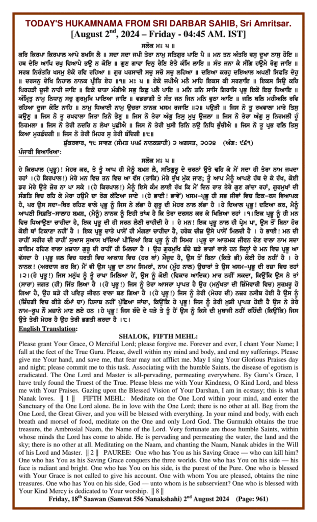 ਅੰਮ੍ਰਿਤ ਵੇਲੇ ਦਾ ਹੁਕਮਨਾਮਾ ਸ੍ਰੀ ਦਰਬਾਰ ਸਾਹਿਬ, ਅੰਮ੍ਰਿਤਸਰ, ਮਿਤੀ 03-08-24 ਅੰਗ 703
