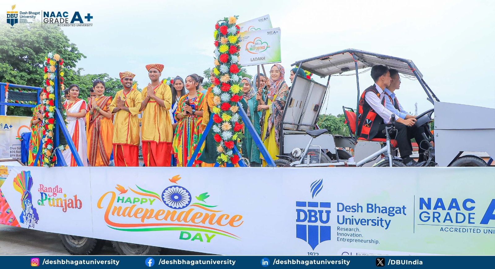 ਇਸ ਦੇ ਨਾਲ ਹੀ, ਦੇਸ਼ ਭਗਤ ਯੂਨੀਵਰਸਿਟੀ ਨੇ ਪੰਜਾਬ ਸਰਕਾਰ ਵੱਲੋਂ ਅਮਲੋਹ ਵਿੱਚ ਕਰਵਾਏ ਗਏ ਇੱਕ ਸ਼ਾਨਦਾਰ ਸੁਤੰਤਰਤਾ ਦਿਵਸ ਸਮਾਗਮ ਵਿੱਚ ਹਿੱਸਾ ਲਿਆ, ਜਿੱਥੇ “ਰੰਗਲਾ ਪੰਜਾਬ” ਥੀਮ ਹੇਠ ਤਕਨਾਲੋਜੀ, ਨਵੀਨਤਾ, ਸਿਹਤ ਸੰਭਾਲ ਅਤੇ ਵਿਭਿੰਨਤਾ ਦੀਆਂ ਝਾਕੀਆਂ ਖਿੱਚ ਦਾ ਕੇਂਦਰ ਬਣੀਆਂ। ਇਨ੍ਹਾਂ ਨੇ ਇੱਕ ਵਿਸ਼ਾਲ ਇਕੱਠ ਨੂੰ ਆਕਰਸ਼ਿਤ ਕੀਤਾ ਅਤੇ ਹਾਜ਼ਰੀਨ ਦੁਆਰਾ ਇਸਦੇ ਵਿਦਿਅਕ ਮੁੱਲ ਅਤੇ ਵਿਭਿੰਨਤਾ ਵਿੱਚ ਏਕਤਾ ਦੇ ਜਸ਼ਨ ਲਈ ਪ੍ਰਸ਼ੰਸਾ ਕੀਤੀ ਗਈ। ਇਸ ਸਮਾਗਮ ਵਿੱਚ ਦੇਸ਼ ਭਗਤ ਯੂਨੀਵਰਸਿਟੀ ਵੱਲੋਂ ਪਰੇਡ ਪ੍ਰਦਰਸ਼ਤ ਕੀਤੀ ਗਈ ਜਿਸ ਵਿੱਚ ਐਨਸੀਸੀ (ਨੈਸ਼ਨਲ ਕੈਡੇਟ ਕੋਰ) ਦੇ ਤਿੰਨੋਂ ਵਿੰਗਾਂ ਦੇ ਬੱਚੇ ਸ਼ਾਮਲ ਸਨ। ਐਸਡੀਐਮ ਅਮਲੋਹ ਕਰਨਦੀਪ ਸਿੰਘ ਨੇ ਪਰੇਡ ਵਿੱਚ ਭਾਗ ਲੈਣ ਵਾਲੇ ਬੱਚਿਆਂ ਨੂੰ ਸਨਮਾਨਿਤ ਵੀ ਕੀਤਾ।