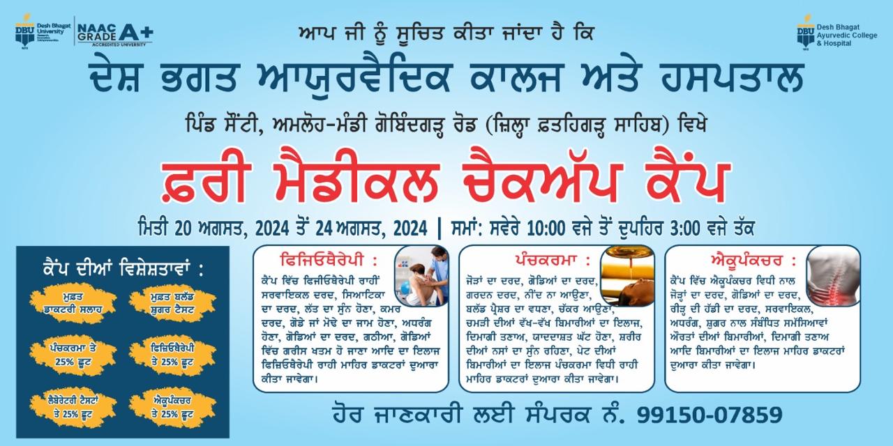 ਦੇਸ਼ ਭਗਤ ਆਯੁਰਵੈਦਿਕ ਕਾਲਜ ਅਤੇ ਹਸਪਤਾਲ ਮੰਡੀ ਗੋਬਿੰਦਗੜ੍ਹ ਵੱਲੋਂ 20 ਅਗਸਤ ਤੋਂ 24 ਅਗਸਤ ਤੱਕ ਮੁਫ਼ਤ ਸਿਹਤ ਜਾਂਚ ਕੈਂਪ ਲਗਾਇਆ ਜਾ ਰਿਹਾ ਹੈ।