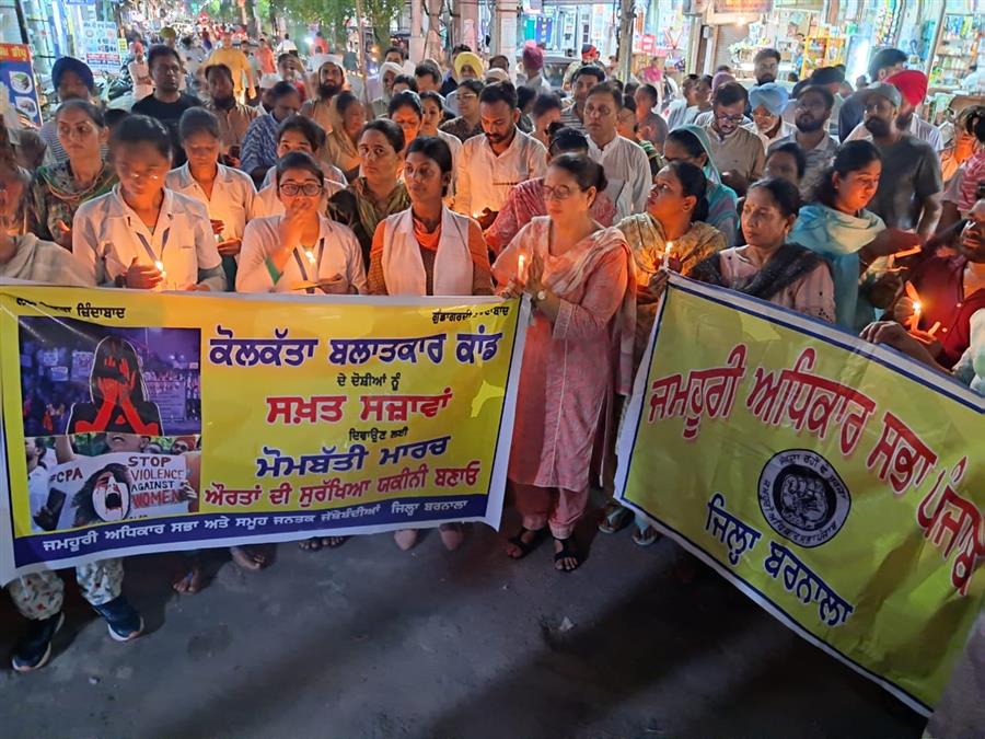 ਅੱਜ ਜਮਹੂਰੀ ਅਧਿਕਾਰ ਸਭਾ ਬਰਨਾਲਾ ਦੇ ਸੱਦੇ ’ਤੇ ਜਿਲ੍ਹੇ ਦੀਆਂ ਸਮੂਹ ਜਨਤਕ ਜਮਹੂਰੀ ਜਥੇਬੰਦੀਆਂ ਨੇ ਸ਼ਹਿਰ ਦੇ ਮੁੱਖ ਬਾਜਾਰਾਂ ਵਿਚ ਰੋਹ-ਭਰਪੂਰ ਮੋਮਬੱਤੀ ਮਾਰਚ ਕਰਕੇ ਕੋਲਕੱਤਾ ਬਲਾਤਕਾਰ ਕਾਂਡ ਦੇ ਦੋਸ਼ੀਆਂ ਨੂੰ ਸਖ਼ਤ ਸਜ਼ਾਵਾਂ ਦੇਣ ਅਤੇ ਹਰ ਵਰਗ ਦੀਆਂ ਔਰਤਾਂ ਦੀ ਸੁਰੱਖਿਆ ਯਕੀਨੀ ਬਣਾਉਣ ਦੀ ਮੰਗ ਕੀਤੀ। ਸਿਵਲ ਹਸਪਤਾਲ ਤੋਂ ਸ਼ਹੀਦ ਭਗਤ ਸਿੰਘ ਰੋਡ, ਹੰਢਿਆਇਆ ਬਾਜ਼ਾਰ, ਸਦਰ ਬਾਜ਼ਾਰ ਵਿਚੋਂ ਦੀ ਕੀਤੇ ਰੋਸ ਮਾਰਚ ਪ੍ਰਤੀ ਆਮ ਸ਼ਹਿਰੀਆਂ ਨੇ ਵੀ ਸਰਗਰਮ ਹੁੰਗਾਰਾ ਭਰਿਆ। ਰੋਸ ਪ੍ਰਦਰਸ਼ਨ ਤੋਂ ਪਹਿਲਾਂ ਮੁਜ਼ਾਹਰਾਕਾਰੀਆਂ ਨੇ ਸਿਵਲ ਹਸਪਤਾਲ ਦੇ ਪਾਰਕ ਵਿਚ ਰੈਲੀ ਕਰਕੇ ਦੇਸ਼ ਦੇ ਮੌਜੂਦਾ ਔਰਤ ਵਿਰੋਧੀ ਅਸੁਰੱਖਿਅਤ ਮਾਹੌਲ ਨੂੰ ਉਜਾਗਰ ਕੀਤਾ। ਇਸ ਇਕੱਤਰਤਾ ਨੂੰ ਜਮਹੂਰੀ ਅਧਿਕਾਰ ਸਭਾ ਬਰਨਾਲਾ ਦੀਆਂ ਸਰਗਰਮ ਔਰਤ ਮੈਂਬਰਾਂ ਪਰਮਜੀਤ ਕੌਰ ਜੋਧਪੁਰ, ਪ੍ਰੇਮਪਾਲ ਕੌਰ ਅਤੇ ਕਮਲਜੀਤ ਕੌਰ ਪੱਤੀ ਤੋਂ ਇਲਾਵਾ ਸਿਹਤ ਵਿਭਾਗ ਪੰਜਾਬ ਦੇ ਡਿਪਟੀ ਡਾਇਰੈਕਟਰ ਡਾਕਟਰ ਜਸਵੀਰ ਸਿੰਘ ਔਲਖ, ਇਨਕਲਾਬੀ ਕੇਂਦਰ ਪੰਜਾਬ ਦੇ ਸੂਬਾ ਪ੍ਰਧਾਨ ਨਰੈਣ ਦੱਤ, ਤਰਕਸ਼ੀਲ ਆਗੂ ਮੇਘ ਰਾਜ ਮਿੱਤਰ, ਪੀਸੀਐੱਮਐੱਸ ਐਸੋਸ਼ੀਏਸਨ ਅਤੇ ਸਿਹਤ ਵਿਭਾਗ ਦੇ ਕਰਮਚਾਰੀਆਂ ਦੀ ਜਥੇਬੰਦੀ ਦੇ ਆਗੂਆਂ, ਡੀਟੀਐੱਫ ਆਗੂ ਅੰਮਰਿਤਪਾਲ ਕੋਟਦੁਨਾ ਅਤੇ ਰਮਨਦੀਪ ਸਿੰਗਲਾ, ਇਸਤਰੀ ਜਾਗਰਿਤੀ ਮੰਚ ਦੀ ਆਗੂ ਚਰਨਜੀਤ ਕੌਰ ਅਤੇ ਵਿਦਿਆਰਥੀ ਆਗੂ ਆਕਿਰਤੀ ਕੌਸ਼ਲ ਨੇ ਸੰਬੋਧਨ ਕਰਦਿਆਂ ਕਿਹਾ ਕਿ ਆਏ ਦਿਨ ਹਰ ਉਮਰ ਤੇ ਹਰ ਵਰਗ ਦੀਆਂ ਔਰਤਾਂ ਦੇ ਬਲਾਤਕਾਰ ਹੋਣਾ ਹੁਣ ਇਕ ਆਮ ਵਰਤਾਰਾ ਬਣ ਗਿਆ ਹੈ। ਔਰਤ ਆਗੂਆਂ ਨੇ ਕਿਹਾ ਕਿ ਬੰਗਾਲ ਦੀ ਸਰਕਾਰ, ਪੁਲਿਸ ਅਤੇ ਮੈਡੀਕਲ ਕਾਲਜ ਪ੍ਰਬੰਧਨ ਨੇ ਦੋਸ਼ੀਆਂ ਨੂੰ ਬਣਾਉਣ ਦੀ ਪੂਰੀ ਕੋਸ਼ਿਸ਼ ਕੀਤੀ। ਦੇਸ਼ ਦਾ ਕੋਈ ਵੀ ਕੋਨਾ ਔਰਤਾਂ ਲਈ ਸੁਰੱਖਿਅਤ ਨਹੀਂ ਰਿਹਾ, ਹਰ ਸੂਬੇ ਵਿਚੋਂ ਦਿਲਾਂ ਨੂੰ ਵਲੂੰਧਰਨ ਵਾਲੀਆਂ ਵਹਿਸ਼ੀ ਖਬਰਾਂ ਆ ਰਹੀਆਂ ਹਨ। ਸਿਆਸੀ ਪਾਰਟੀਆਂ ਇਨ੍ਹਾਂ ਸ਼ਰਮਨਾਕ ਘਟਨਾਵਾਂ ਨੂੰ ਆਪਣੀਆਂ ਸਿਆਸੀ ਰੋਟੀਆਂ ਸੇਕਣ ਲਈ ਵਰਤਦੀਆਂ ਹਨ। ਸਿਹਤ ਮਹਿਕਮੇ ਦੀਆਂ ਔਰਤ ਕਰਮਚਾਰੀ ਆਪਣੇ ਰਾਤ-ਬਰਾਤੇ ਵਾਲੇ ਕੰਮ-ਸਮੇਂ ਦੇ ਚੱਲਦਿਆਂ ਇਨ੍ਹਾਂ ਦਰਿੰਦਿਆਂ ਦਾ ਆਸਾਨ ਸ਼ਿਕਾਰ ਬਣ ਜਾਂਦੀਆਂ ਹਨ। ਤਿੰਨ ਸਾਲ ਤੋਂ ਲੈ ਕੇ 93 ਸਾਲ ਤੱਕ ਦੀਆਂ ਔਰਤਾਂ ਇਨ੍ਹਾਂ ਵਹਿਸ਼ੀ ਦਰਿੰਦਿਆਂ ਦਾ ਸ਼ਿਕਾਰ ਬਣ ਰਹੀਆਂ ਹਨ। ਬਲਾਤਕਾਰੀਆਂ ਨੂੰ ਰਾਜਸੀ ਸਰਪ੍ਰਸਤੀ ਹਾਸਲ ਕਰਵਾ ਕੇ ਆਪਣੇ ਸਿਆਸੀ ਹਿੱਤਾਂ ਲਈ ਵਰਤਿਆ ਜਾਂਦਾ ਹੈ।