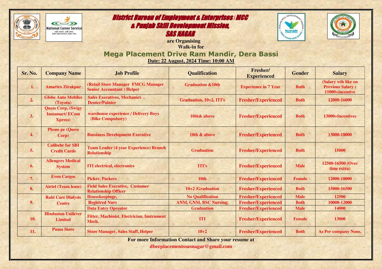 ਜ਼ਿਲ੍ਹਾ ਰੋਜ਼ਗਾਰ ਅਤੇ ਕਾਰੋਬਾਰ ਬਿਊਰੋ ਵੱਲੋਂ 22 ਅਗਸਤ ਨੂੰ ਰਾਮ ਮੰਦਰ ਭਵਨ ਡੇਰਾਬੱਸੀ ਵਿਖੇ ਮੈਗਾ ਪਲੇਸਮੈਂਟ ਕੈਂਪ ਲਾਇਆ ਜਾਵੇਗਾ