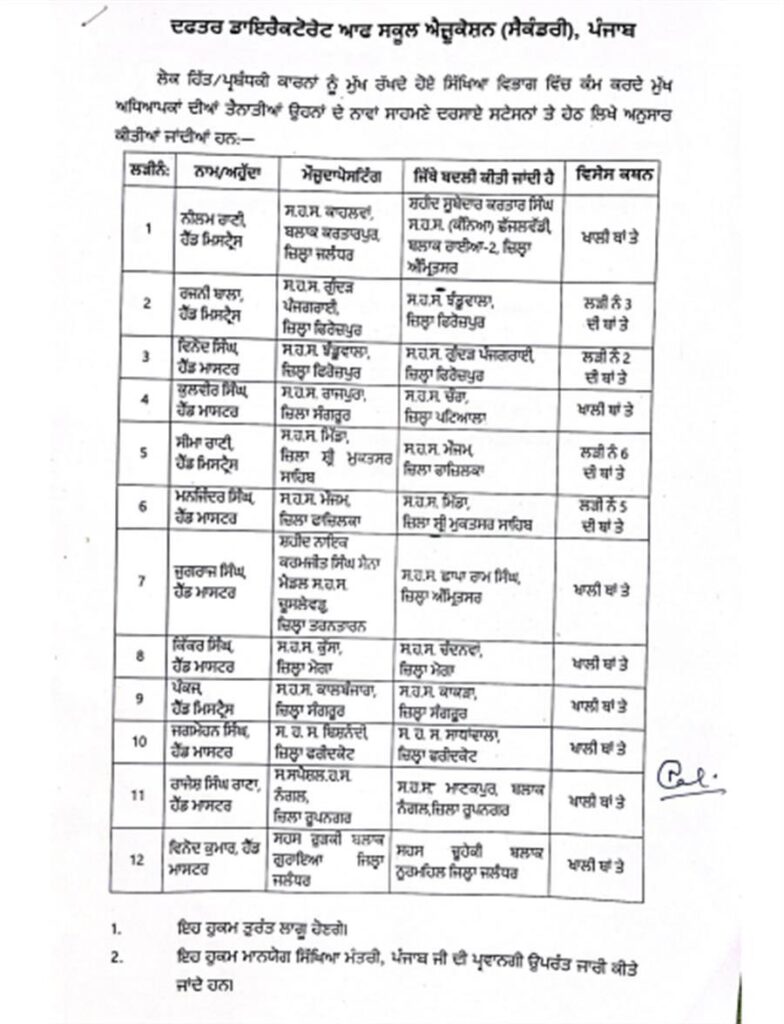 ਪੰਜਾਬ ‘ਚ ਮੁੱਖ ਅਧਿਆਪਕਾਂ ਦੇ ਤਬਾਦਲੇ