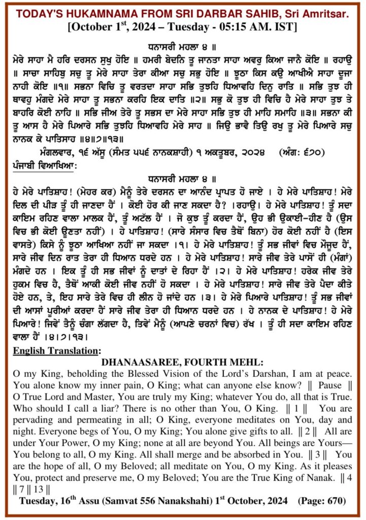 ਅੰਮ੍ਰਿਤ ਵੇਲੇ ਦਾ ਹੁਕਮਨਾਮਾ ਸ੍ਰੀ ਦਰਬਾਰ ਸਾਹਿਬ, ਅੰਮ੍ਰਿਤਸਰ, ਮਿਤੀ 01-10-24 ,ਅੰਗ 670