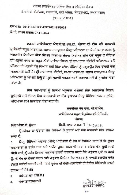 ਸਿੱਖਿਆ ਵਿਭਾਗ ਵੱਲੋਂ ਡਿਊਟੀ ‘ਚ ਕੁਤਾਹੀ ਵਰਤਣ ‘ਤੇ ਅਧਿਆਪਕ ਨੂੰ ਮੁਅੱਤਲ ਕੀਤਾ ਗਿਆ ਹੈ।