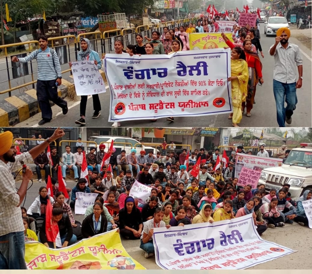 ਪੰਜਾਬ ਸਟੂਡੈਂਟਸ ਯੂਨੀਅਨ ਵੱਲੋਂ ਪੰਜਾਬ ਵਾਸੀਆਂ ਨੂੰ ਸਰਕਾਰੀ ਨੌਕਰੀਆਂ ਚ 90 ਫੀਸਦੀ ਰਾਖਵਾਂਕਰਨ ਅਤੇ ਸਿੱਖਿਆ ਨੂੰ ਰਾਜ ਦਾ ਵਿਸ਼ਾ ਬਣਾਉਣ ਦੀ ਮੰਗ ਨੂੰ ਲੈਕੇ ਆਮ ਆਦਮੀ ਪਾਰਟੀ ਦੇ ਹਲਕਾ ਚੱਬੇਵਾਲ ਤੋਂ ਉਮੀਦਵਾਰ ਇਸ਼ਾਂਕ ਕੁਮਾਰ ਖ਼ਿਲਾਫ਼ ਸ਼ਹਿਰ ਚ ਨਾਅਰੇਬਾਜ਼ੀ ਕਰਕੇ ਆਪ ਦੇ ਦਫ਼ਤਰ ਅੱਗੇ ਧਰਨਾ ਪ੍ਰਦਰਸ਼ਨ ਕੀਤਾ ਗਿਆ। ਮੌਕੇ ਤੇ ਤਹਿਸੀਲਦਾਰ ਰਣਜੀਤ ਸਿੰਘ ਨੇ ਪਹੁੰਚ ਕੇ ਮੰਗ ਪੱਤਰ ਲੈਣ ਉਪਰੰਤ ਧਰਨਾ ਸਮਾਪਤ ਕੀਤਾ ਗਿਆ। ਇਸ ਮੌਕੇ ਸੰਬੋਧਨ ਕਰਦਿਆਂ ਪੀਐੱਸਯੂ ਦੇ ਸੂਬਾ ਪ੍ਰਧਾਨ ਰਣਵੀਰ ਸਿੰਘ ਕੁਰੜ,ਸੂਬਾ ਵਿੱਤ ਸਕੱਤਰ ਬਲਜੀਤ ਸਿੰਘ ਧਰਮਕੋਟ ਅਤੇ ਪ੍ਰੈੱਸ ਸਕੱਤਰ ਮੰਗਲਜੀਤ ਪੰਡੋਰੀ ਨੇ ਕਿਹਾ ਕਿ ਪੰਜਾਬ ਵਾਸੀਆਂ ਨੂੰ ਸਰਕਾਰੀ ਨੌਕਰੀਆਂ ਚ 90 ਫੀਸਦੀ ਰਾਖਵਾਂਕਰਨ ਦਿੱਤਾ ਜਾਵੇ। ਕਿਉਂਕਿ ਪੰਜਾਬ ਵਿੱਚ ਵੱਡੇ ਪੱਧਰ ਤੇ ਪੰਜਾਬ ਵਾਸੀਆਂ ਦੀ ਵਜਾਏ ਦੂਸਰੇ ਰਾਜਾਂ ਦੇ ਲੋਕਾਂ ਨੂੰ ਨੌਕਰੀਆਂ ਦਿੱਤੀਆਂ ਜਾ ਰਹੀਆਂ ਹਨ। ਇਸ ਤੇ ਕੋਈ ਵੀ ਨਿਯਮ ਨਹੀਂ ਲਾਗੂ ਕੀਤਾ ਜਾ ਰਿਹਾ। ਮੁੱਖ ਮੰਤਰੀ ਭਗਵੰਤ ਮਾਨ ਨੇ ਮੈਂਬਰ ਪਾਰਲੀਮੈਂਟ ਹੁੰਦਿਆਂ ਪ੍ਰੈੱਸ ਕਾਨਫਰੰਸ ਕਰਕੇ ਕਿਹਾ ਸੀ ਕਿ ਪੰਜਾਬ ਸਟੇਟ ਟਰਾਂਸਮਿਸ਼ਨ ਕਾਰਪੋਰੇਸ਼ਨ ਲਿਮਟਿਡ ਚ 95 ਅਸਿਸਟੈਂਟ ਲਾਈਨਮੈਨ ਦੀਆਂ ਸੀਟਾਂ ਵਿਚੋਂ 64 ਸੀਟਾਂ ਦੂਸਰੇ ਰਾਜਾਂ ਦੇ ਲੋਕਾਂ ਨੂੰ ਦਿੱਤੀਆਂ ਗਈਆਂ, ਇਸੇ ਤਰ੍ਹਾਂ 39 ਅਸਿਸਟੈਂਟ ਸਬ ਸਟੇਸ਼ਨ ਸੀਟਾਂ ਚੋਂ 28,