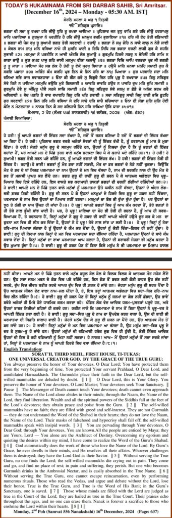 ਅੰਮ੍ਰਿਤ ਵੇਲੇ ਦਾ ਹੁਕਮਨਾਮਾ ਸ੍ਰੀ ਦਰਬਾਰ ਸਾਹਿਬ, ਅੰਮ੍ਰਿਤਸਰ, ਮਿਤੀ 16-12-2024,ਅੰਗ 637