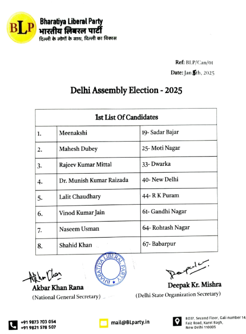 BLP(ਭਾਰਤੀ ਲਿਬਰਲ ਪਾਰਟੀ) ਨੇ ਆਉਣ ਵਾਲੀਆਂ ਦਿੱਲੀ ਵਿਧਾਨ ਸਭਾ ਚੋਣਾਂ 2025 ਲਈ 8 ਉਮੀਦਵਾਰਾਂ ਦੀ ਪਹਿਲੀ ਸੂਚੀ ਦਾ ਐਲਾਨ ਕਰ ਦਿੱਤਾ ਹੈ। ਪਾਰਟੀ ਸਾਰੀਆਂ 70 ਸੀਟਾਂ ‘ਤੇ ਚੋਣ ਲੜਨ ਲਈ ਵਚਨਬੱਧ ਹੈ ਅਤੇ ਹੁਣ ਉਮੀਦਵਾਰਾਂ ਦੀ ਪਹਿਲੀ ਸੂਚੀ ਜਾਰੀ ਕਰ ਦਿੱਤੀ ਗਈ ਹੈ। ਇਹ ਸਾਰੇ ਉਮੀਦਵਾਰ ਸਿਰਫ਼ ਸਿਆਸੀ ਆਗੂ ਹੀ ਨਹੀਂ, ਸਗੋਂ ਵੱਖ-ਵੱਖ ਖੇਤਰਾਂ ਦੇ ਸਰਗਰਮ ਵਰਕਰ ਅਤੇ ਪੇਸ਼ੇਵਰ ਹਨ, ਜੋ BLP ਦੀ ਤਬਦੀਲੀ ਅਤੇ ਤਰੱਕੀ ਦੀ ਵਿਚਾਰਧਾਰਾ ਨੂੰ ਗ੍ਰਹਿਣ ਕਰਦੇ ਹਨ।