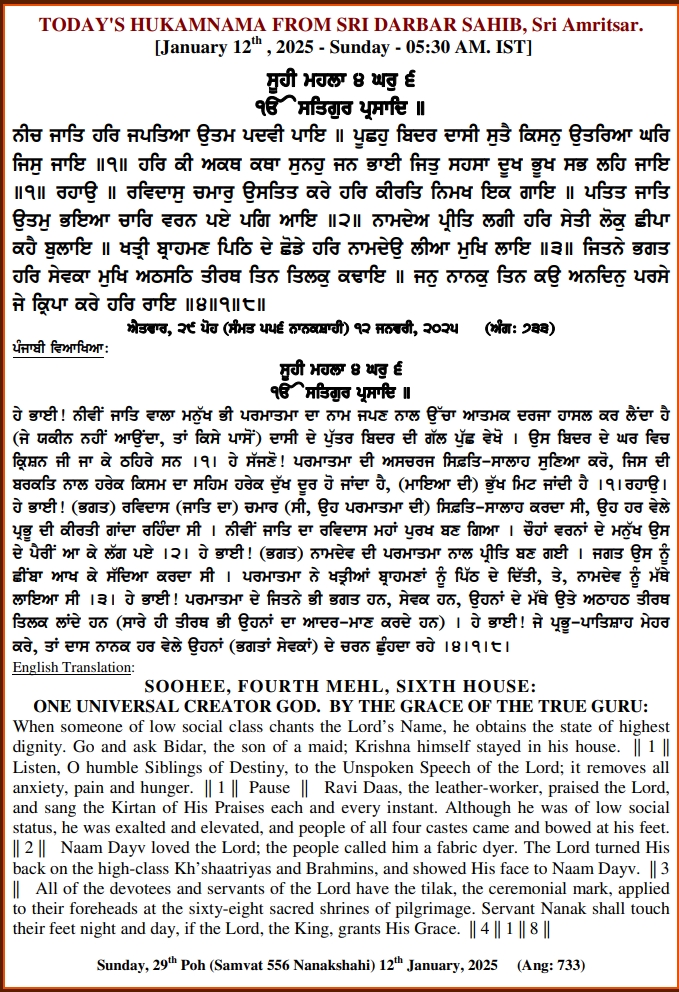 ਅੰਮ੍ਰਿਤ ਵੇਲੇ ਦਾ ਹੁਕਮਨਾਮਾ ਸ੍ਰੀ ਦਰਬਾਰ ਸਾਹਿਬ, ਅੰਮ੍ਰਿਤਸਰ, ਮਿਤੀ 12-01-2025 ,ਅੰਗ 733