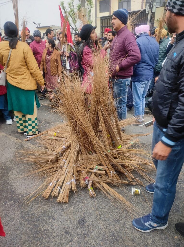 ਝੂਠੇ ਵਾਅਦਿਆਂ ਦੀ ਲੋਹੜੀ ਫੂਕ ਕੇ ਕੀਤਾ ਸਰਕਾਰ ਦਾ ਪਿੱਟ ਸਿਆਪਾ- ਅਨੋਖਾ ਪ੍ਰਦਰਸ਼ਨ – ਪਾਰਟੀ ਪ੍ਰਧਾਨ ਦੇ ਘਰ ਅੱਗੇ ਝਾੜੂ ਸੁੱਟ ਕੇ ਲਗਾਇਆ ਝਾੜੂਆਂ ਦਾ ਢੇਰ