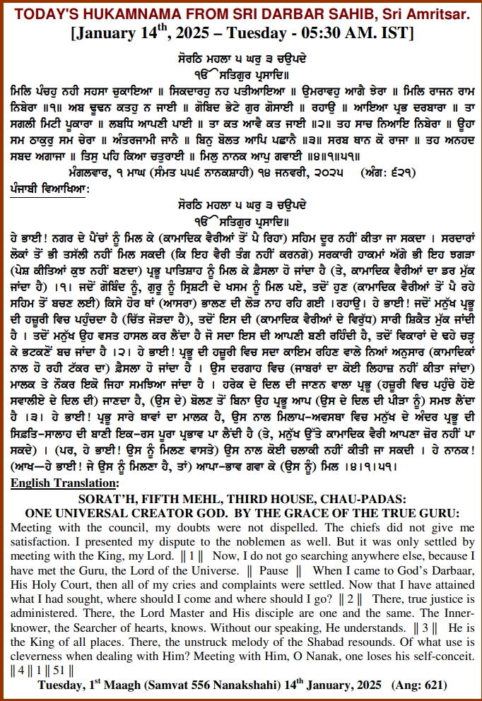 ਅੰਮ੍ਰਿਤ ਵੇਲੇ ਦਾ ਹੁਕਮਨਾਮਾ ਸ੍ਰੀ ਦਰਬਾਰ ਸਾਹਿਬ, ਅੰਮ੍ਰਿਤਸਰ, ਮਿਤੀ 14-01-2025,ਅੰਗ 621