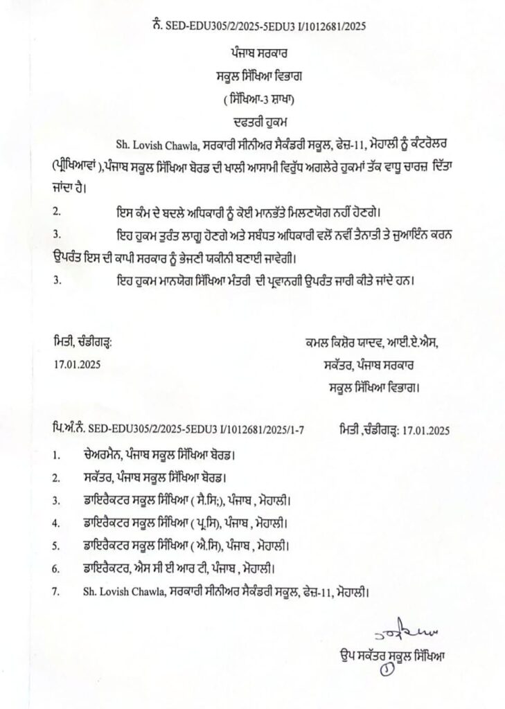 ਪੰਜਾਬ ਸਕੂਲ ਸਿੱਖਿਆ ਬੋਰਡ ਵਿੱਚ ਕੰਟਰੋਲਰ ਪ੍ਰੀਖਿਆਵਾਂ ਦੀ ਖਾਲੀ ਪਈ ਅਸਾਮੀ ਦਾ ਲਵੀਸ਼ ਚਾਵਲਾ ਸਰਕਾਰੀ ਸੀਨੀਅਰ ਸੈਕੰਡਰੀ ਸਕੂਲ ਫੇਜ਼ 11 ਮੋਹਾਲੀ ਨੂੰ ਵਾਧੂ ਚਾਰਜ ਦਿੱਤਾ ਗਿਆ ਹੈ। ਇਸ ਸਬੰਧੀ ਸਕੱਤਰ, ਸਕੂਲ ਸਿੱਖਿਆ ਵਿਭਾਗ ਵੱਲੋਂ ਪੱਤਰ ਜਾਰੀ ਕੀਤਾ ਗਿਆ ਹੈ।