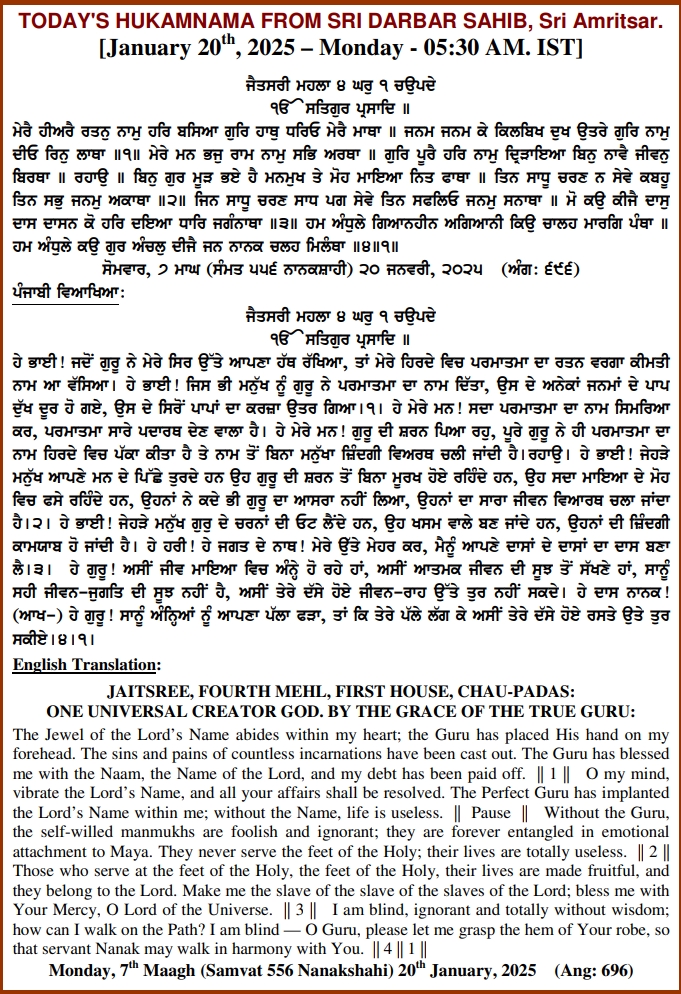 ਅੰਮ੍ਰਿਤ ਵੇਲੇ ਦਾ ਹੁਕਮਨਾਮਾ ਸ੍ਰੀ ਦਰਬਾਰ ਸਾਹਿਬ, ਅੰਮ੍ਰਿਤਸਰ, ਮਿਤੀ 20-01-2025 ,ਅੰਗ 696
