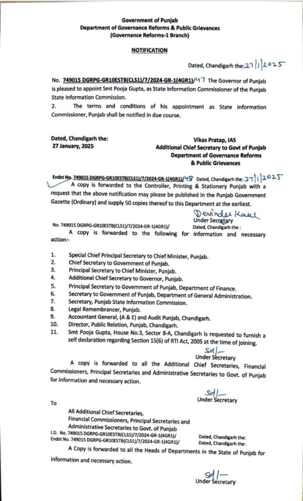 ਪੰਜਾਬ ਸਰਕਾਰ ਵੱਲੋਂ ਚੰਡੀਗੜ੍ਹ ਦੀ ਉੱਘੀ ਸਮਾਜ ਸੇਵਕ ਅਤੇ ਸਿੱਖਿਆ ਸ਼ਾਸਤਰੀ ਪੂਜਾ ਗੁਪਤਾ ਨੂੰ ਸੂਬਾ ਸੂਚਨਾ ਕਮਿਸ਼ਨਰ ਲਗਾਇਆ ਹੈ। ਮਿਲੀ ਜਾਣਕਾਰੀ ਅਨੁਸਾਰ ਉਨ੍ਹਾਂ ਨੇ ਪੰਜਾਬ ਯੂਨੀਵਰਸਿਟੀ ਤੋਂ ਕਾਮਰਸ ਗ੍ਰੈਜੂਏਟ ਅਤੇ ਪੋਸਟ ਗ੍ਰੈਜੂਏਟ ਦੀ ਡਿਗਰੀ ਕੀਤੀ ਹੋਈ ਹੈ। ਪੂਜਾ ਗੁਪਤਾ ਦਾ ਪਤੀ ਸੁਨੀਲ ਗੁਪਤਾ ਇੱਕ ਪ੍ਰਮੁੱਖ ਚਾਰਟਰਡ ਅਕਾਊਂਟੈਂਟ ਹਨ ਅਤੇ ਪੰਜਾਬ ਸਰਕਾਰ ਵਿੱਚ ਕੈਬਨਿਟ ਰੈਂਕ ਉੱਤੇ ਹਨ।