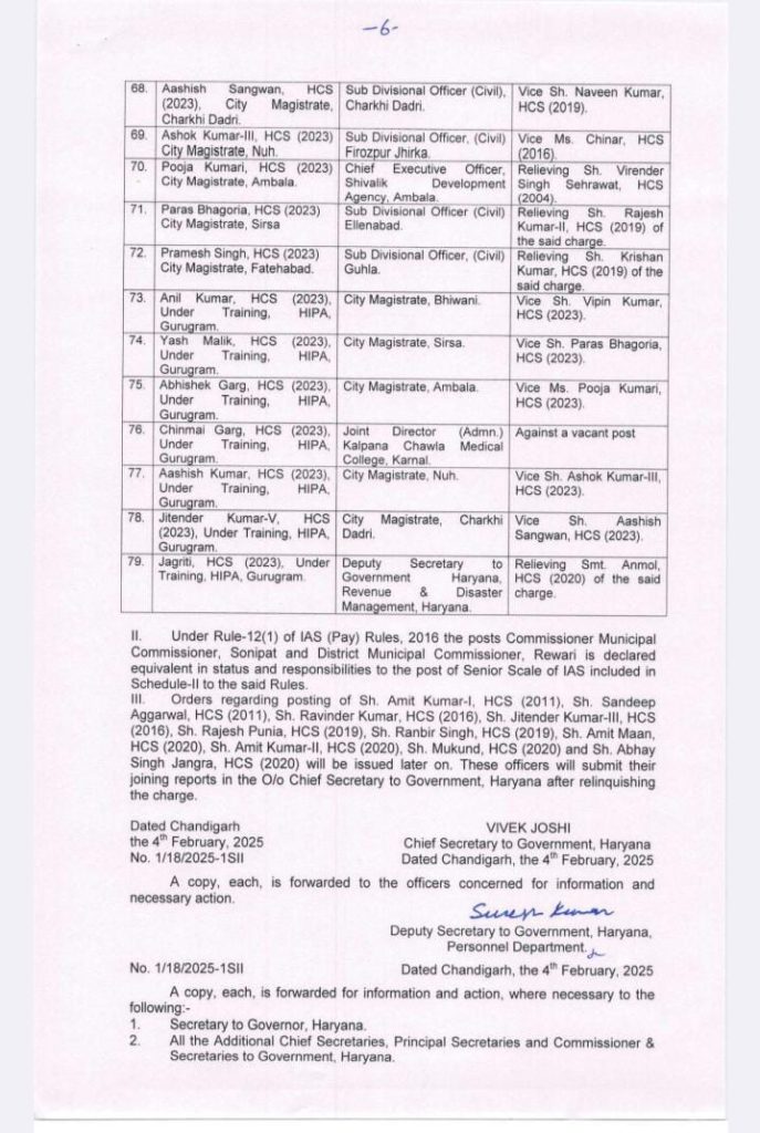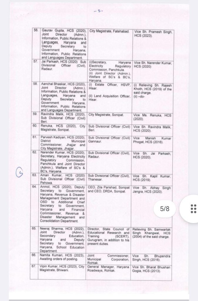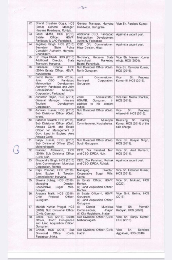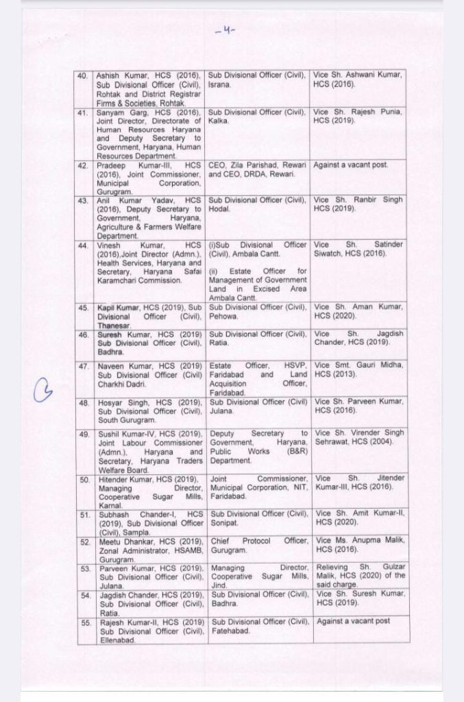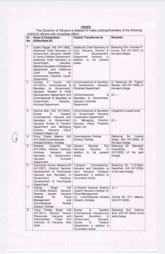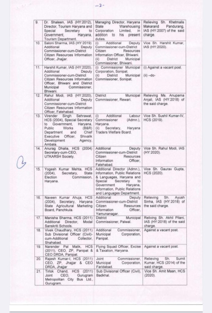 ਹਰਿਆਣਾ ਸਰਕਾਰ ਨੇ ਵੱਡੇ ਪੱਧਰ ‘ਤੇ ਪ੍ਰਸ਼ਾਸਨਿਕ ਫੇਰਬਦਲ ਕਰਦੇ ਹੋਏ 12 IAS ਅਤੇ 67 HCS ਅਧਿਕਾਰੀਆਂ ਦੇ ਤਬਾਦਲੇ ਕੀਤੇ ਹਨ।