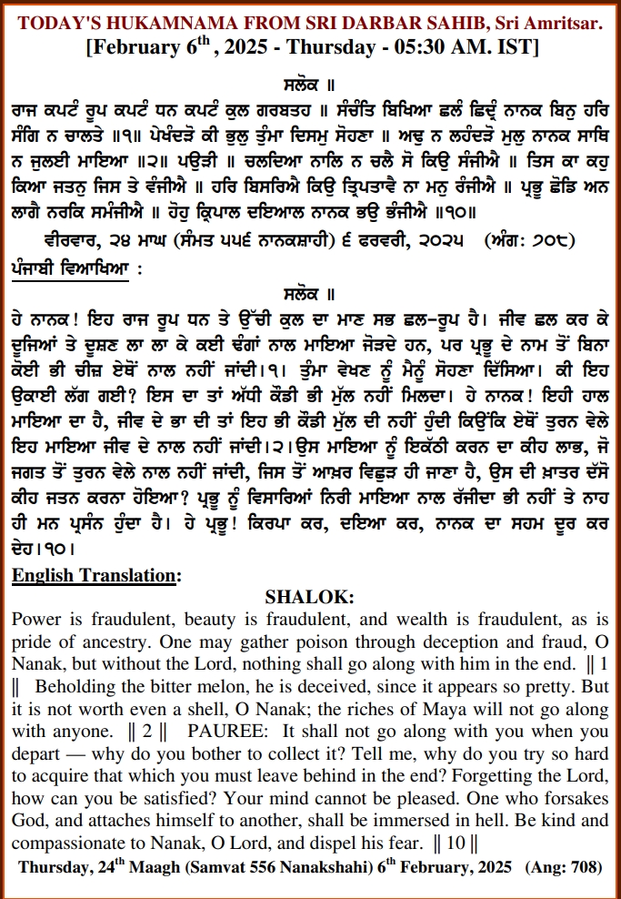 ਅੰਮ੍ਰਿਤ ਵੇਲੇ ਦਾ ਹੁਕਮਨਾਮਾ ਸ੍ਰੀ ਦਰਬਾਰ ਸਾਹਿਬ, ਅੰਮ੍ਰਿਤਸਰ, ਮਿਤੀ 06-02-2025,ਅੰਗ 708