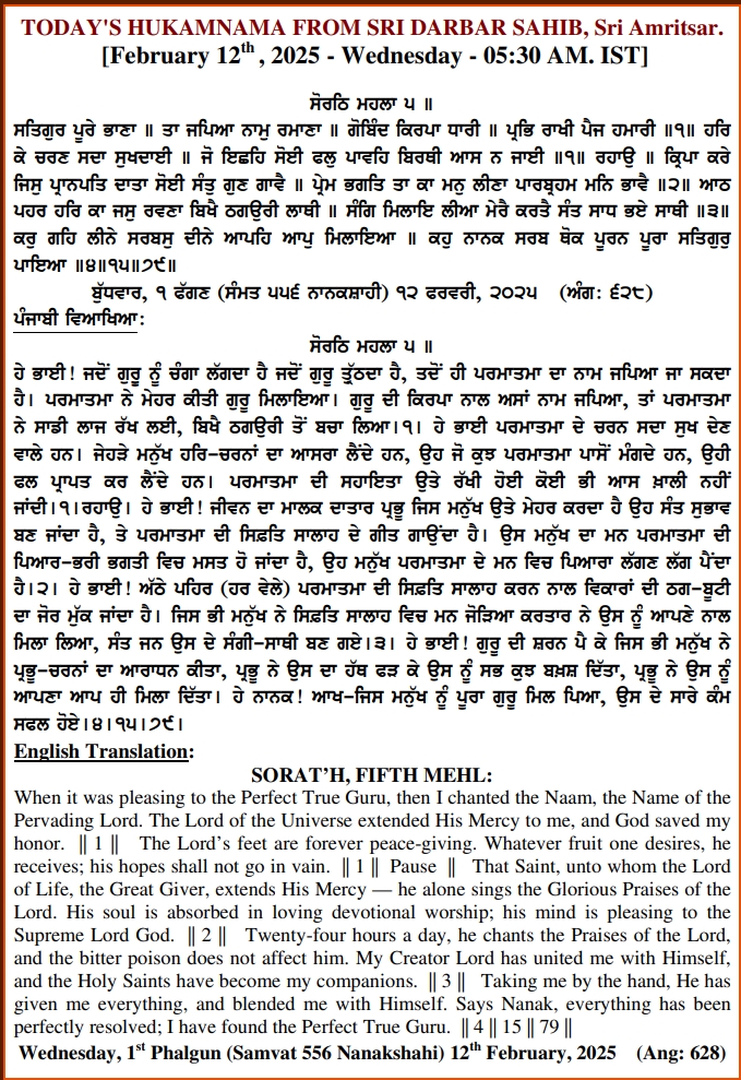 ਅੰਮ੍ਰਿਤ ਵੇਲੇ ਦਾ ਹੁਕਮਨਾਮਾ ਸ੍ਰੀ ਦਰਬਾਰ ਸਾਹਿਬ, ਅੰਮ੍ਰਿਤਸਰ, ਮਿਤੀ 12-02-2025,ਅੰਗ 628